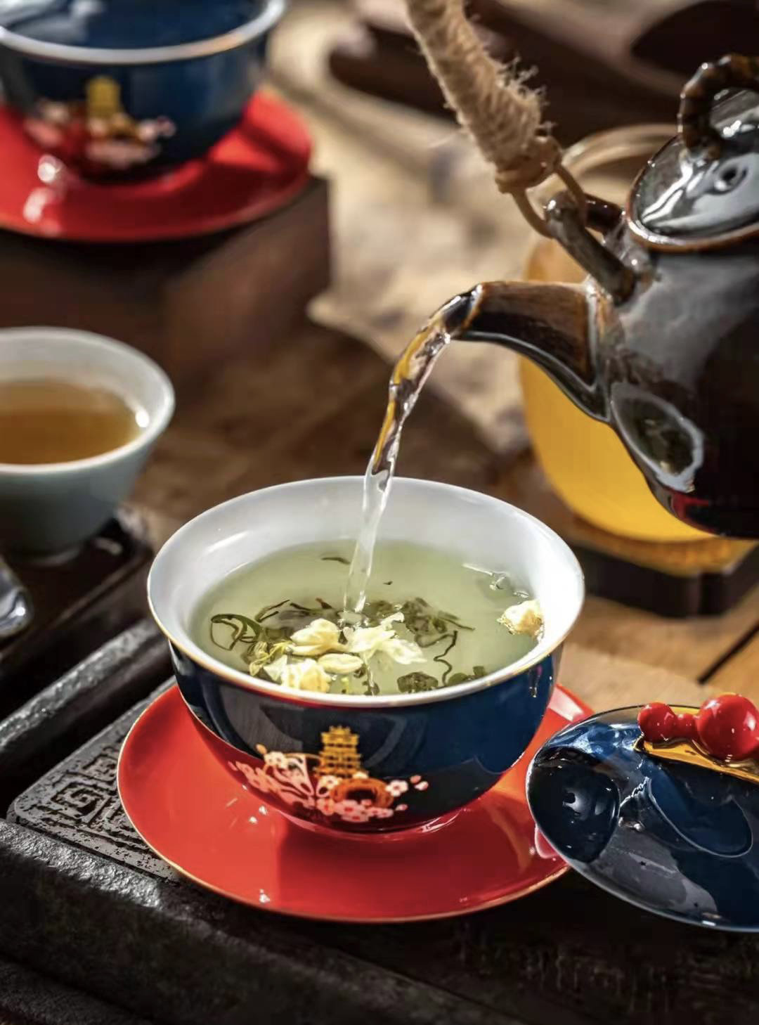 盖钮以川剧常出现的红缨头饰作为造型基础,由一个主钮和两个副钮组成,主钮方便拿取茶盖,副钮拿捏便于拂去花茶表面浮花,解决了传统盖碗盖钮碰鼻的尴尬,茶碗造型乖巧外部为颜色鲜亮的有色釉内部为白色,便于观察茶汤色泽茶船子高度适中,手感舒适端取方便不烫手。