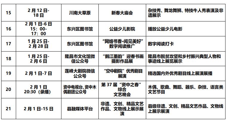 从线上活动覆盖范围来看,黎明介绍,内江选择了热门的景区景点和市民常去的商圈、购物中心等开展新春文化活动,威远万达广场、川南大草原等地都将开展舞台文艺节目展演,也能进一步扩大文化活动的受众群体。