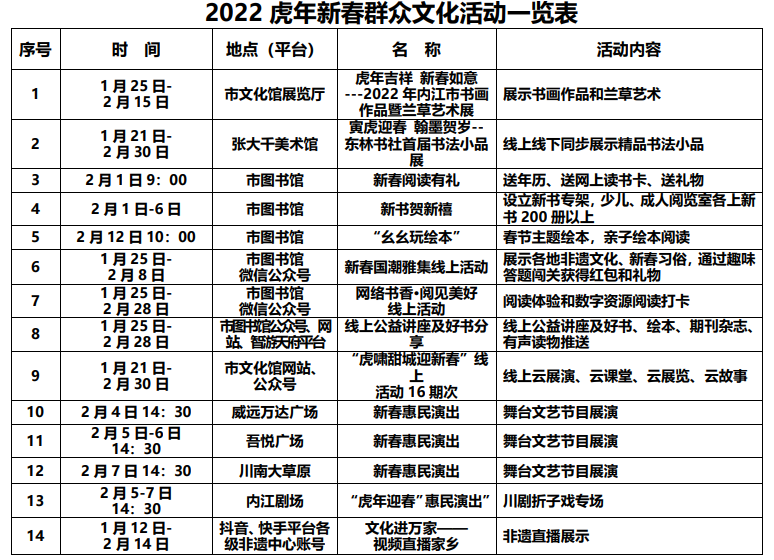 1月26日,记者从内江市文广旅局获悉,内江市2022虎年新春一系列群众文化活动安排已出炉。内江将深挖文化内涵,深入开展形式多样的群众性节日活动,让全市群众在新春的节日氛围中品味丰盛的文化“盛宴”。