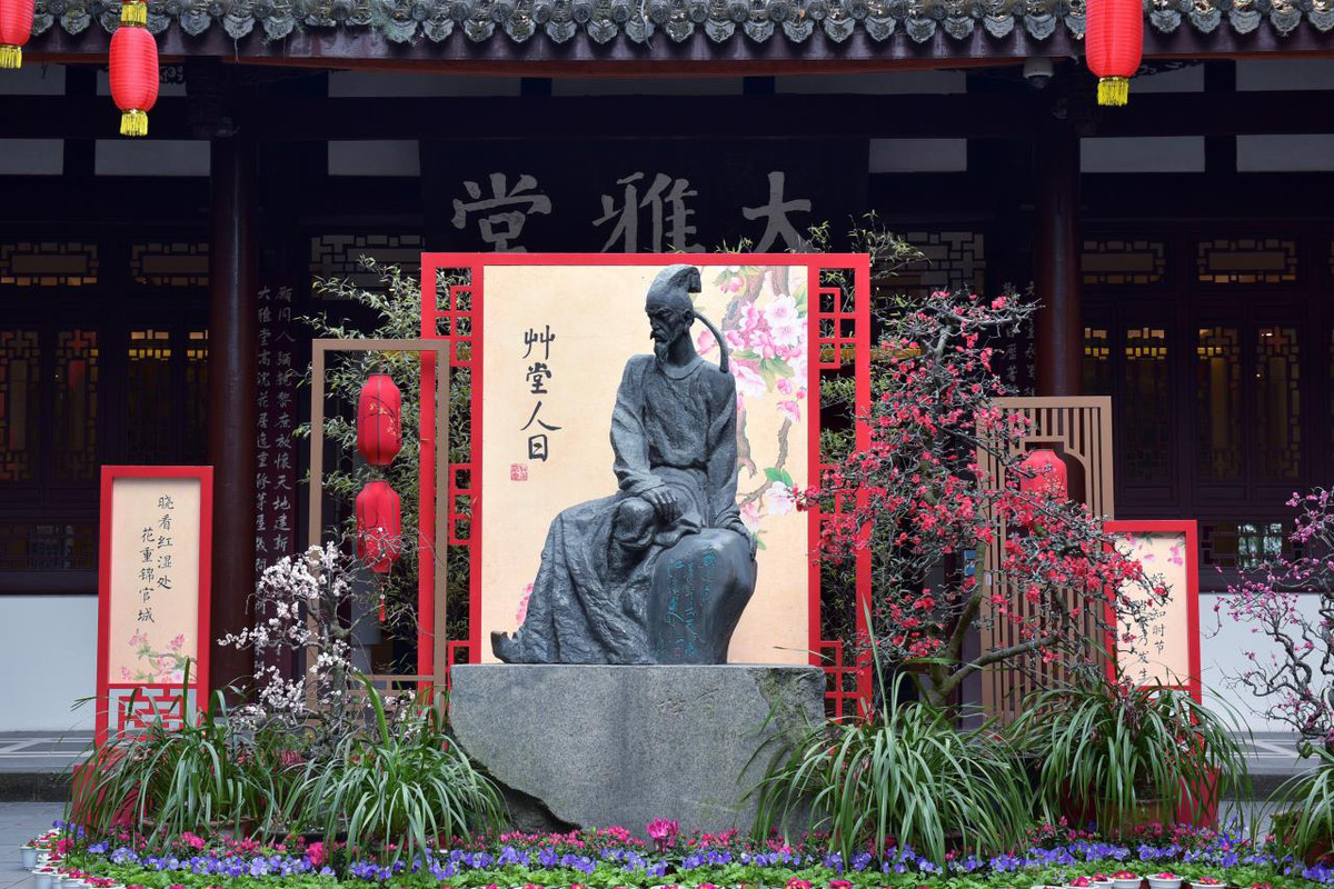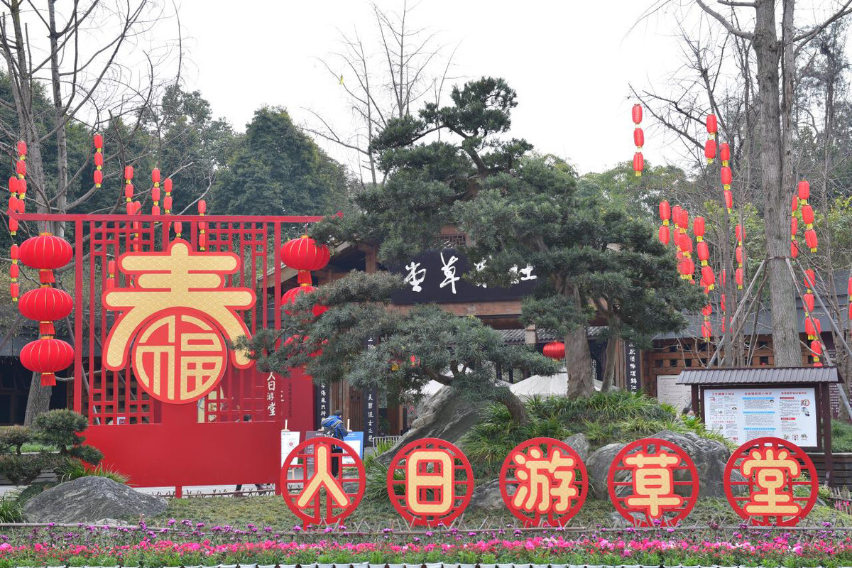 草堂内,第五十届成都杜甫草堂博物馆梅花艺术展奏响“早梅报春”的序曲,红梅桩头、川派盆景、迎新鲜花,在草堂厚重的历史文化氛围与清幽雅致的西蜀古典园林的衬托下,营造出“一树独先天下春”、“千朵万朵压枝低”的春意盎然景象,为广大游客献上一台繁花似锦、诗情画意的早春赏花盛宴。浣花溪,“二十里寻香道”项目浣花溪段疏影横斜、红梅探春等姹紫嫣红、千姿百态的梅花新景观,一步一景,再现杜甫笔下“花重锦官城”的诗意景观。