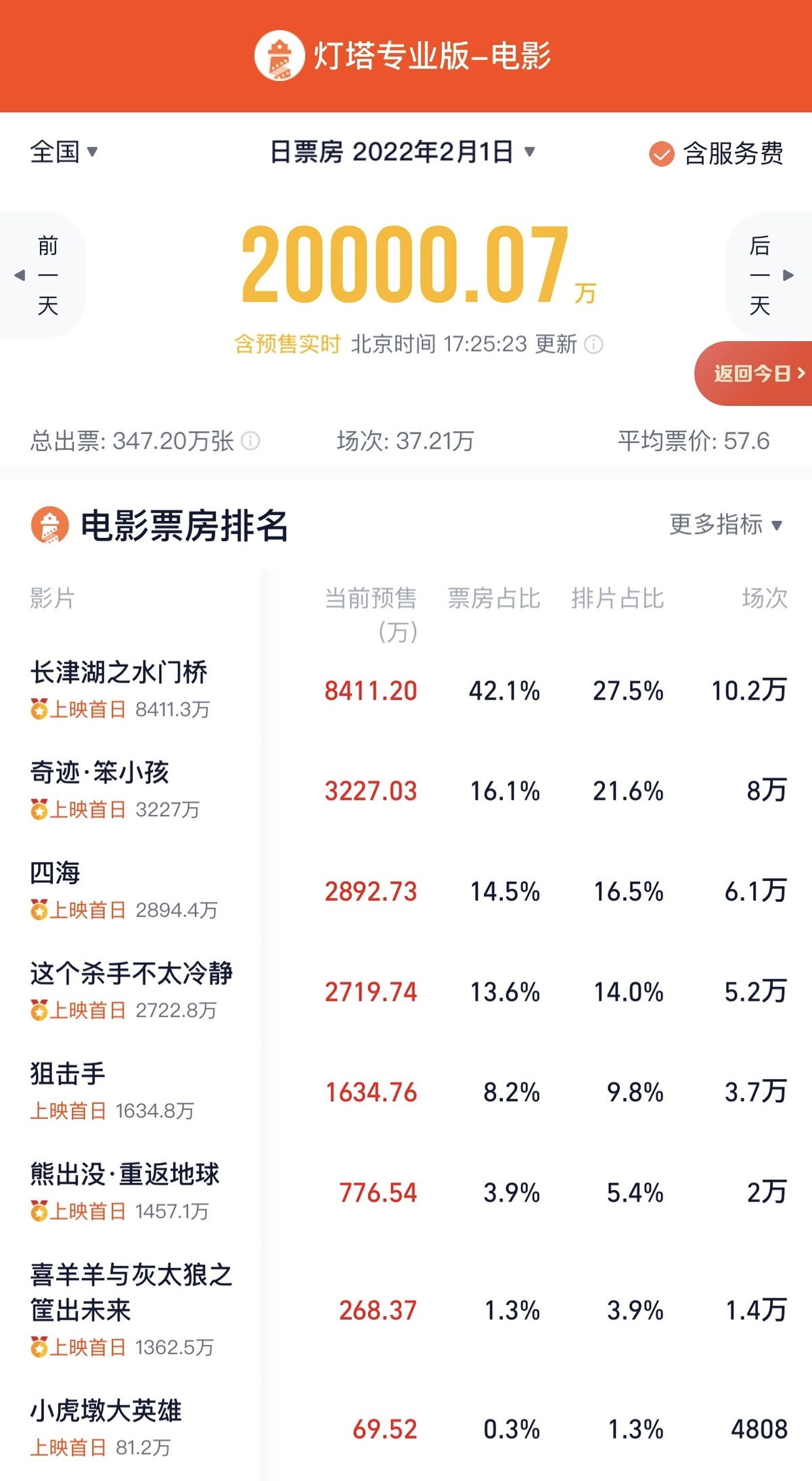 据灯塔专业版数据显示,截至1月26日17时许,2022大年初一(2月1日)当天电影预售总票房突破2亿元。