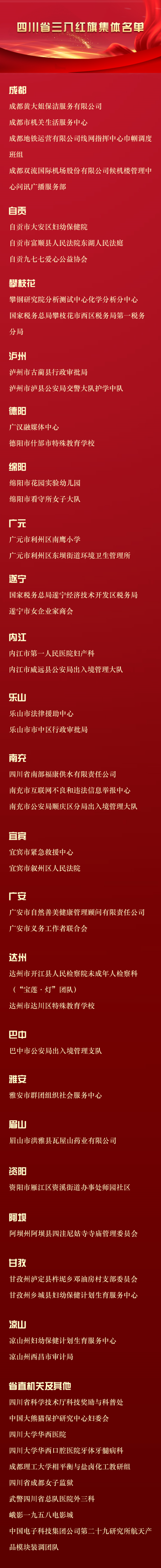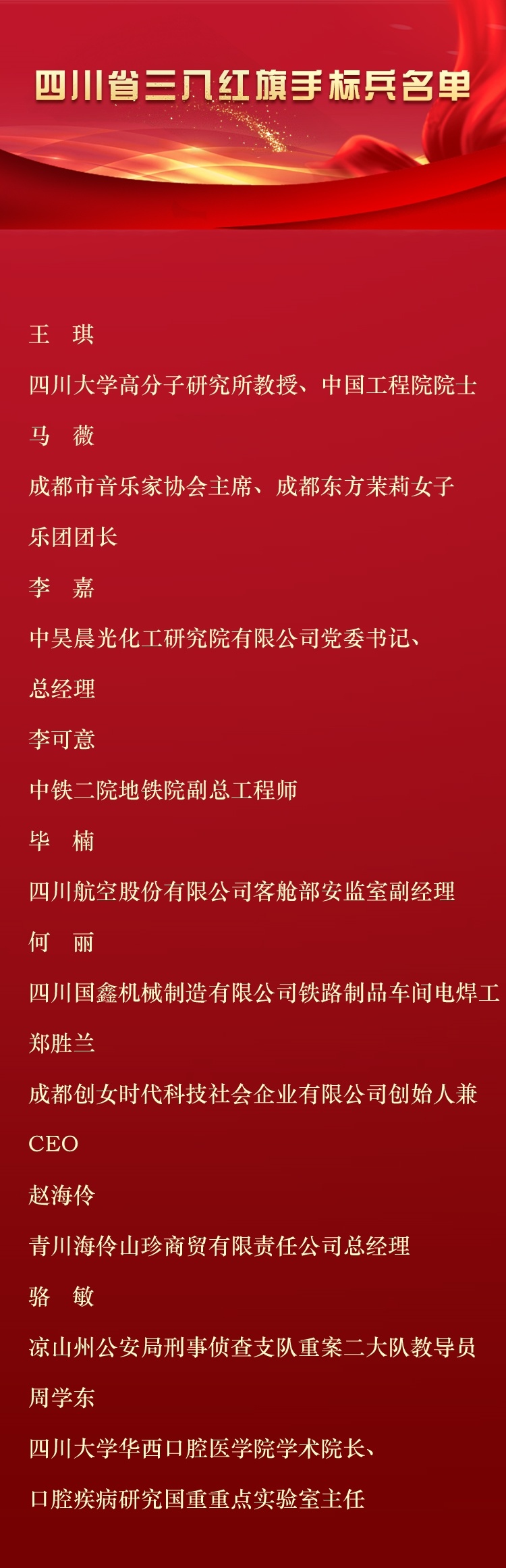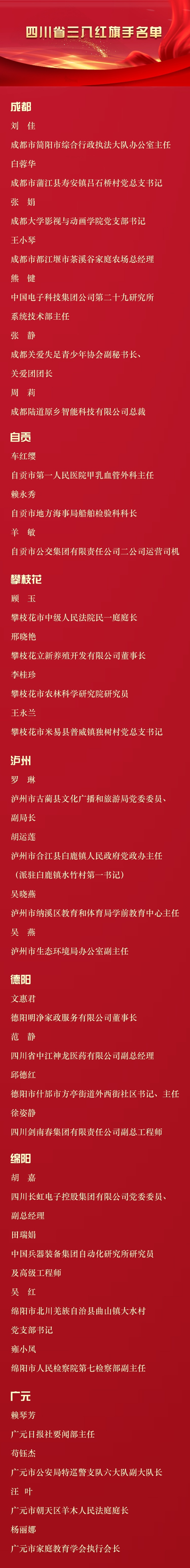 记者6月11日从四川省妇联获悉,为表彰先进、树立典型,广泛宣传优秀女性和集体的先进事迹,用榜样的力量引导和激励广大妇女,四川省妇女联合会、四川省人力资源和社会保障厅决定,授予王琪等10人四川省三八红旗手标兵、刘佳等100人四川省三八红旗手、成都黄大姐保洁服务有限公司等50个单位四川省三八红旗集体称号。