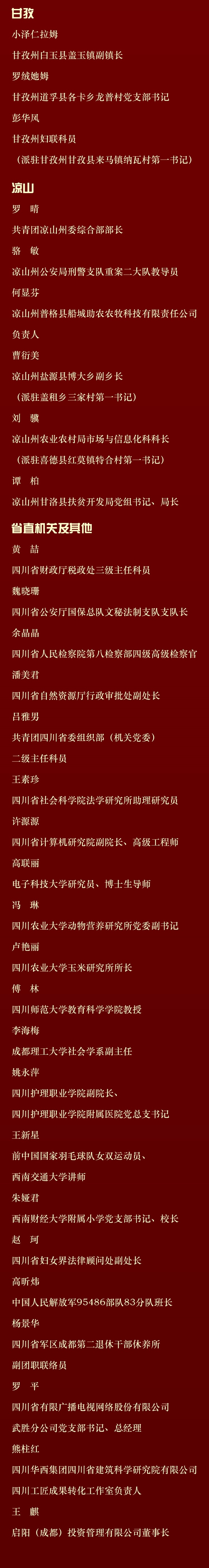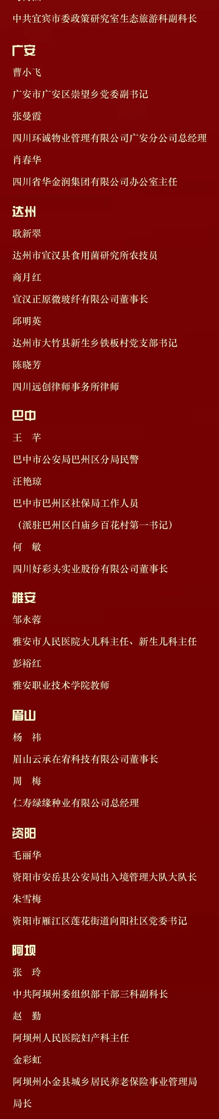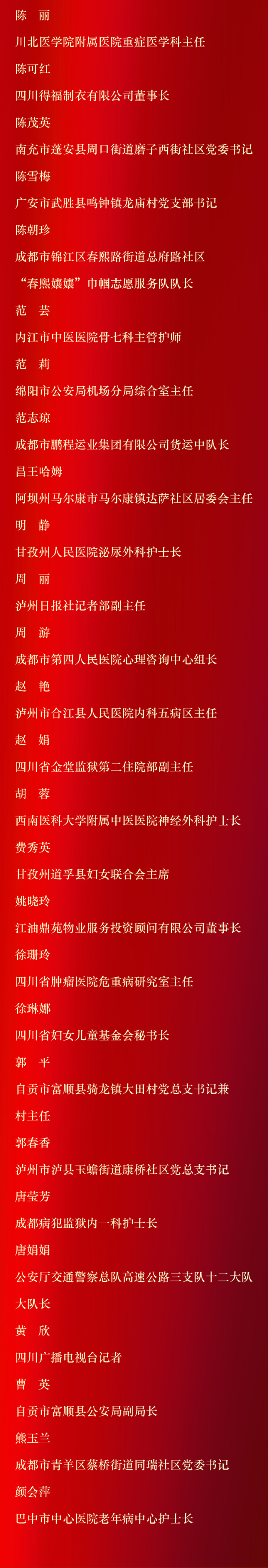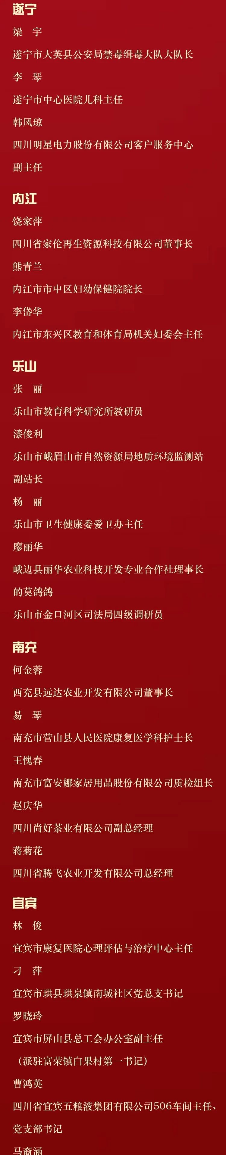 记者6月11日从四川省妇联获悉,为表彰先进、树立典型,广泛宣传优秀女性和集体的先进事迹,用榜样的力量引导和激励广大妇女,四川省妇女联合会、四川省人力资源和社会保障厅决定,授予王琪等10人四川省三八红旗手标兵、刘佳等100人四川省三八红旗手、成都黄大姐保洁服务有限公司等50个单位四川省三八红旗集体称号。