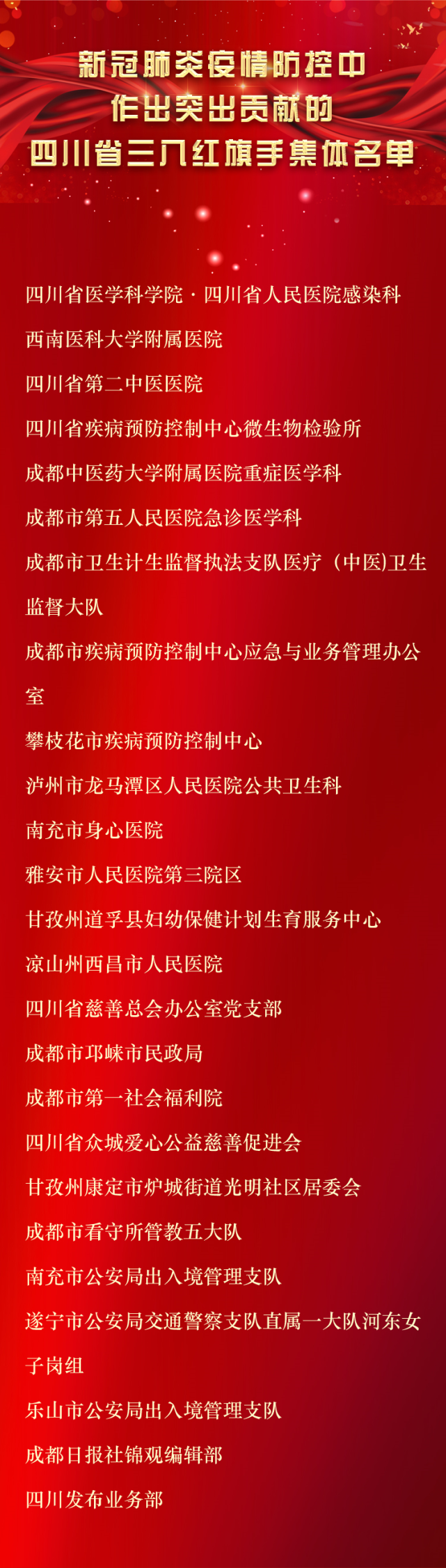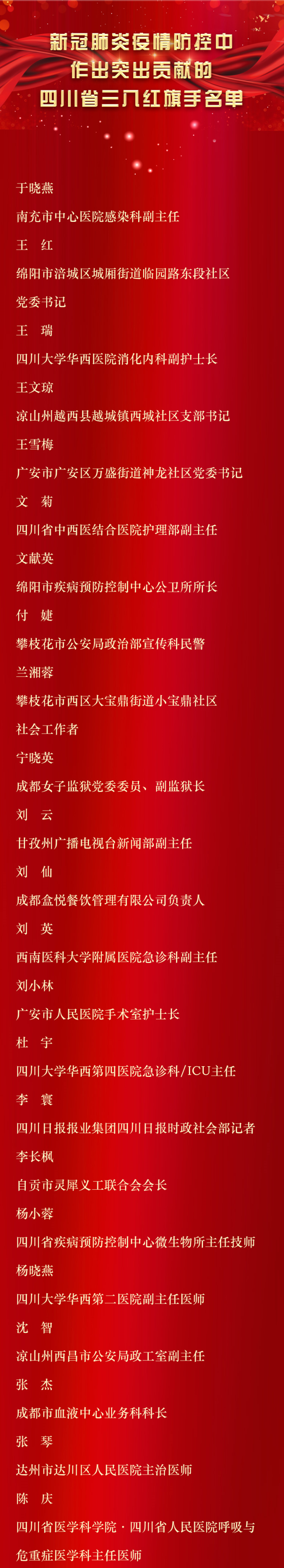 此外,广泛宣传新冠肺炎疫情防控工作中作出突出贡献的优秀女性和集体的先进事迹,激励各行各业妇女坚定必胜信念,保持昂扬斗志,毫不松懈继续为统筹推进疫情防控和经济社会发展贡献巾帼力量,四川省妇女联合会、四川省人力资源和社会保障厅决定,授予于晓燕等50人四川省三八红旗手、四川省医学科学院·四川省人民医院感染科等25个单位四川省三八红旗集体称号。