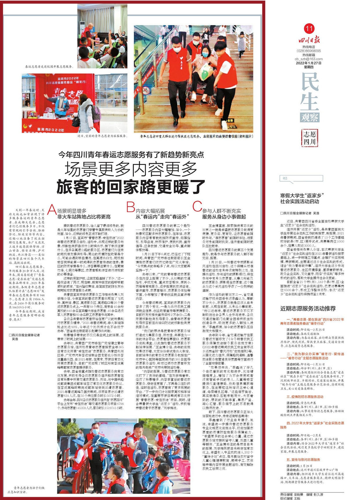 四川春运志愿服务,年均服务20余万人次。近年来,团省委创建了“青春志愿·爱在旅途”交通志愿服务品牌项目,2021年春运期间,各级青年志愿者队伍累计在“志愿四川”发布春运志愿服务项目948个,志愿者上岗19506人次,在2430个岗位服务时长166319.5小时。