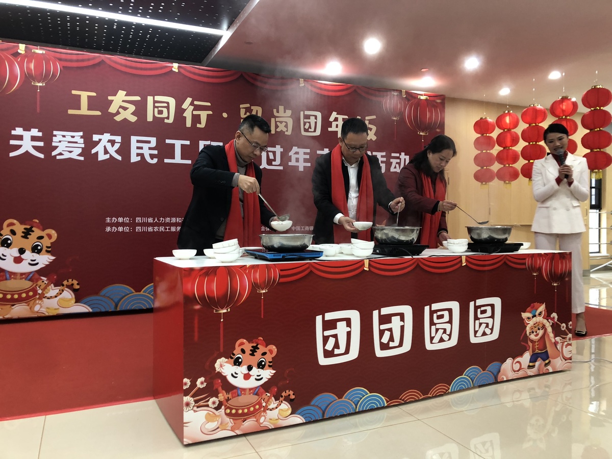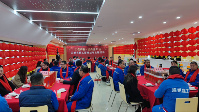 当天,由四川省人社厅、工商银行四川省分行主办的“工友同行·留岗团年饭”关爱农民工留岗过年主题活动在这里正式启动。四川省、眉山市人社部门的工作人员们和留岗过年的农民工代表一起吃团年饭,共话家常,并向他们发放慰问金和年货礼包,现场洋溢着喜庆热闹的气氛。