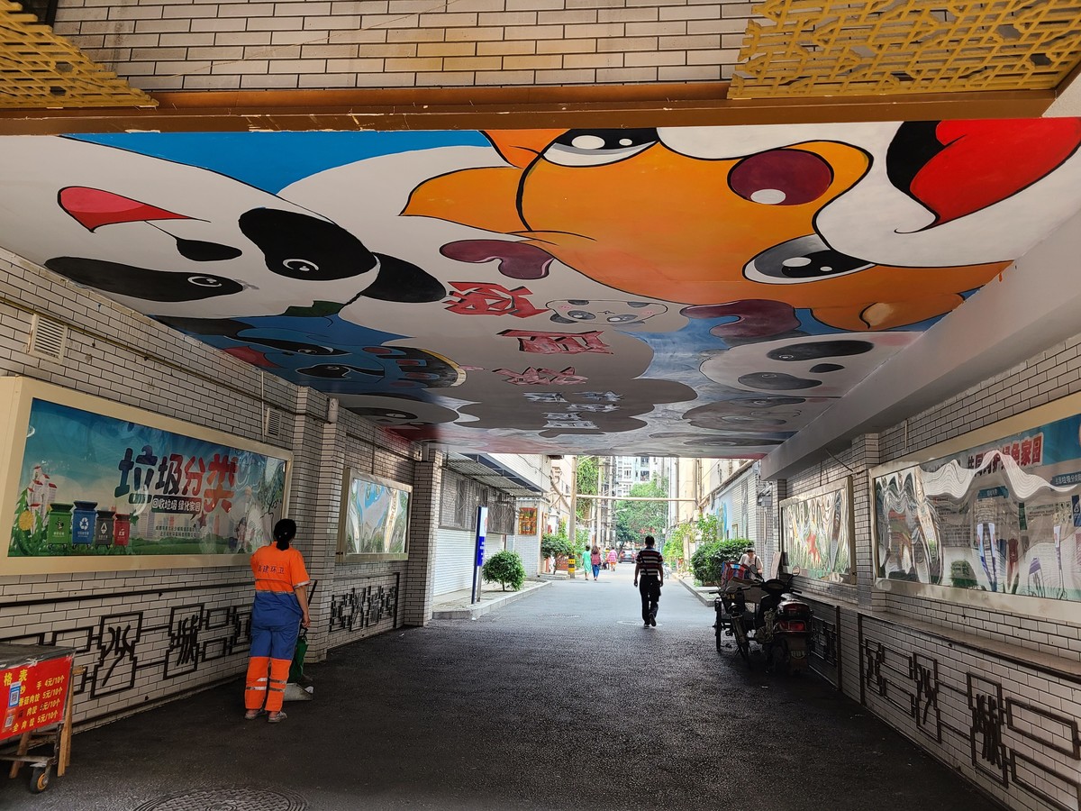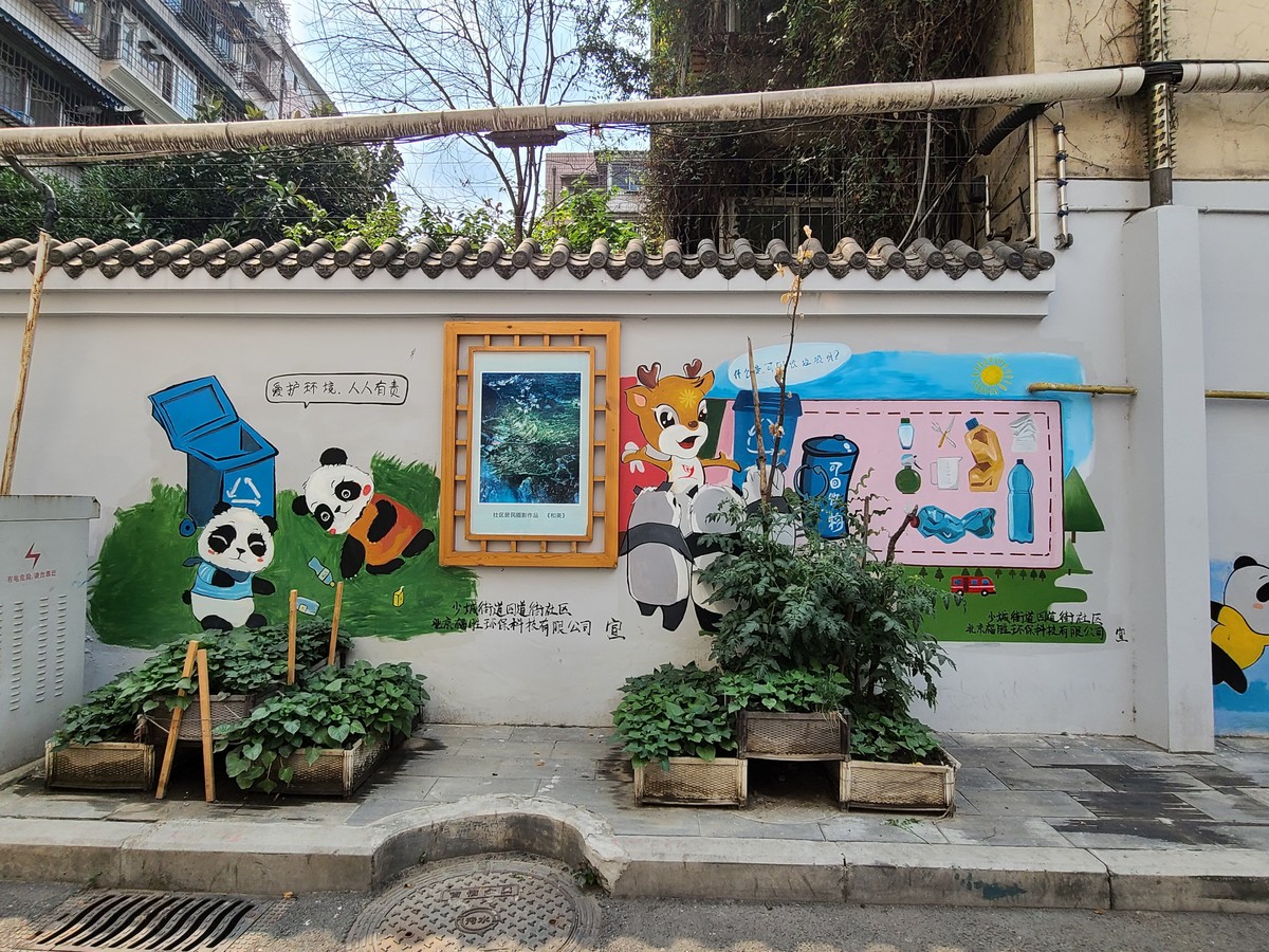 走过“封面”,进入了街区。不宽的小街,墙白路净院子整洁,街道两旁连续的院墙上,都是熊猫和“暖小四”在各个垃圾分类处理现场的画面,萌萌的,可爱又生动。
