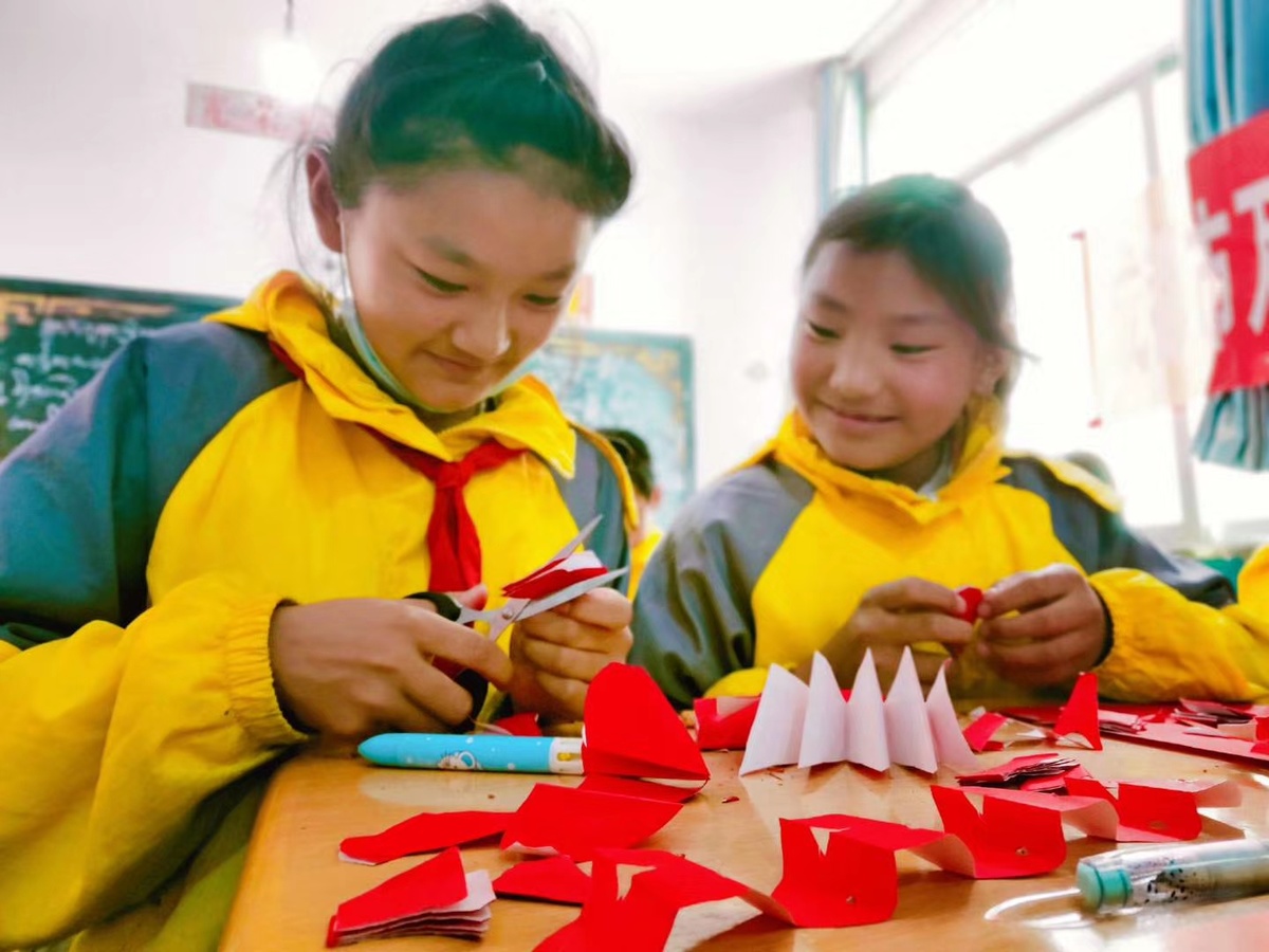 “你们快看我剪的这串蝴蝶多漂亮!”白玛娜错高举着自己的作品兴奋地喊叫着。在得荣县斯闸乡中心小学,成都市万春小学教师吴佳钰带束了一堂生动有趣的剪纸艺术课。