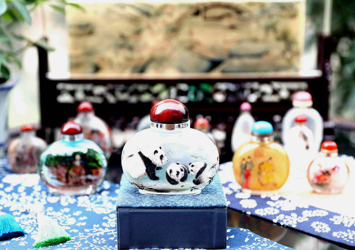 来自新津区的内画鼻烟壶也能看到熊猫元素的身影,内画鼻烟壶经过选料、做工、画工、包装等一系列工艺流程,用时少则一周,多则数月,色彩一遍遍干后再染,即使细微处,也尽显丰富的层次。