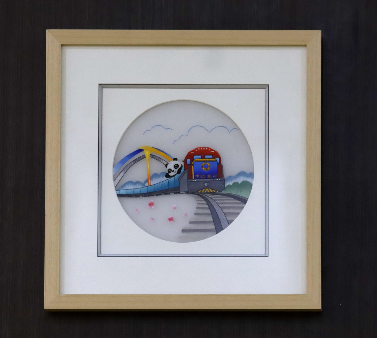 来自青白江的蜀绣《熊猫走世界·中欧班列》