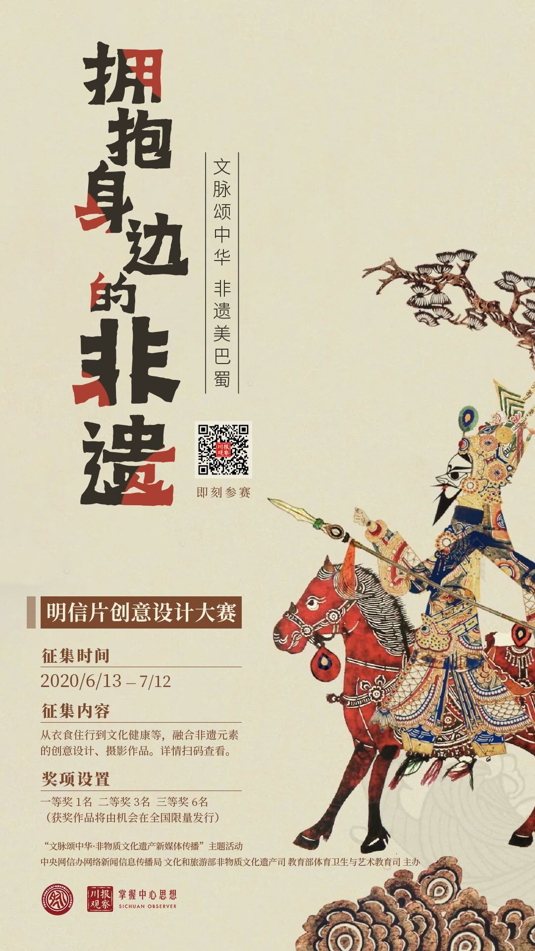 由中央网信办网络新闻信息传播局、文化和旅游部非物质文化遗产司、教育部体育卫生与艺术教育司共同主办的“文脉颂中华·非物质文化遗产新媒体传播”主题活动,自去年7月18日启动后,精彩不断。作为主题活动四川参与方,即日起,四川省委网信办、川报观察将推出“拥抱身边的非遗”明信片创意设计大赛,将视角投向广大网友的日常生活,期待每一位网友用创意描绘我们身边触手可及、历久弥新的非物质文化遗产,鼓励更多网友拥抱传统文化、发现非遗之美,传承和弘扬中华优秀传统文化。