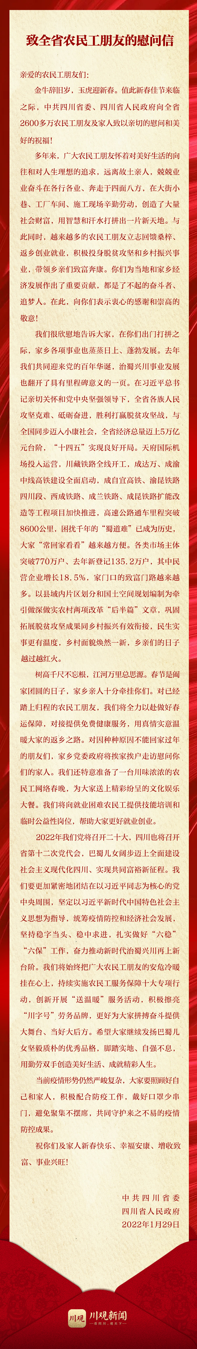 新春佳节来临之际,中共四川省委、四川省人民政府发出慰问信,向全省2600多万农民工朋友及家人致以亲切的慰问和美好的祝福!祝大家新春快乐、幸福安康、增收致富、事业兴旺!