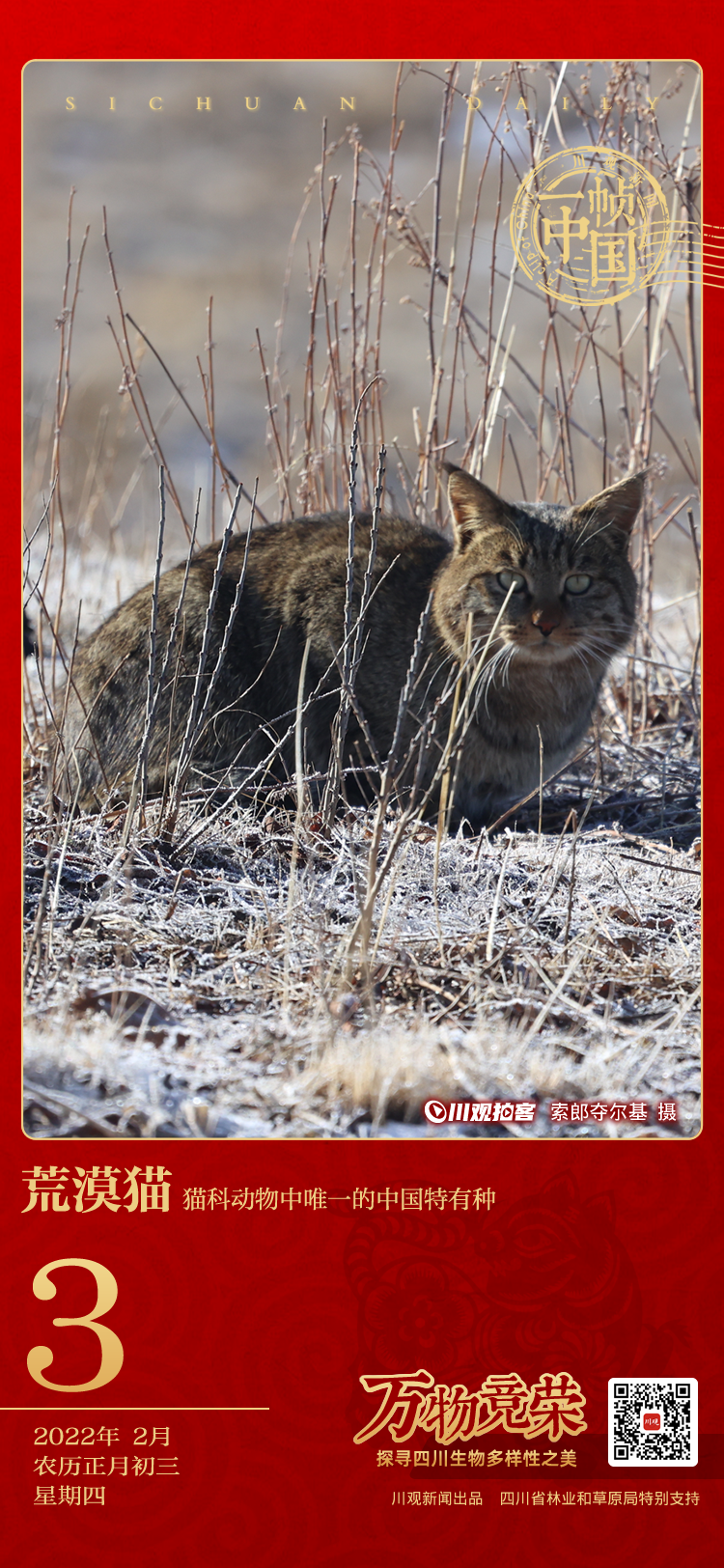荒漠猫是中国13种猫科动物中唯一的中国特有品种。2011年出版的《中国生物物种名录》记载,荒漠猫主要分布于四川、新疆、内蒙古、陕西、甘肃、宁夏和青海等省区,主要活动于海拔2800米至4100米的高山草甸、高山灌木丛以及荒漠半荒漠的地区,以鼠兔、鼹鼠、旱獭、野鸡等小型野生动物为食,在高山草甸的食物链当中,它几乎位于顶端,是名副其实的“王者”。