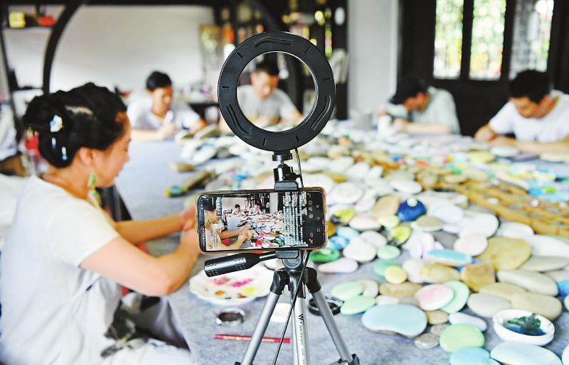 南充市蓬安县非遗传承人卢静利用当地丰富的鹅卵石资源,开发出“嘉陵江石画”系列产品。6月12日,在该县一工坊,画师利用网络平台展示嘉陵江石画制作过程。 刘永红 摄(视觉四川)