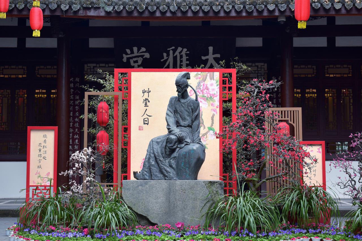 “人日游草堂”第十三届成都诗圣文化节开幕,杜甫草堂装点一新。