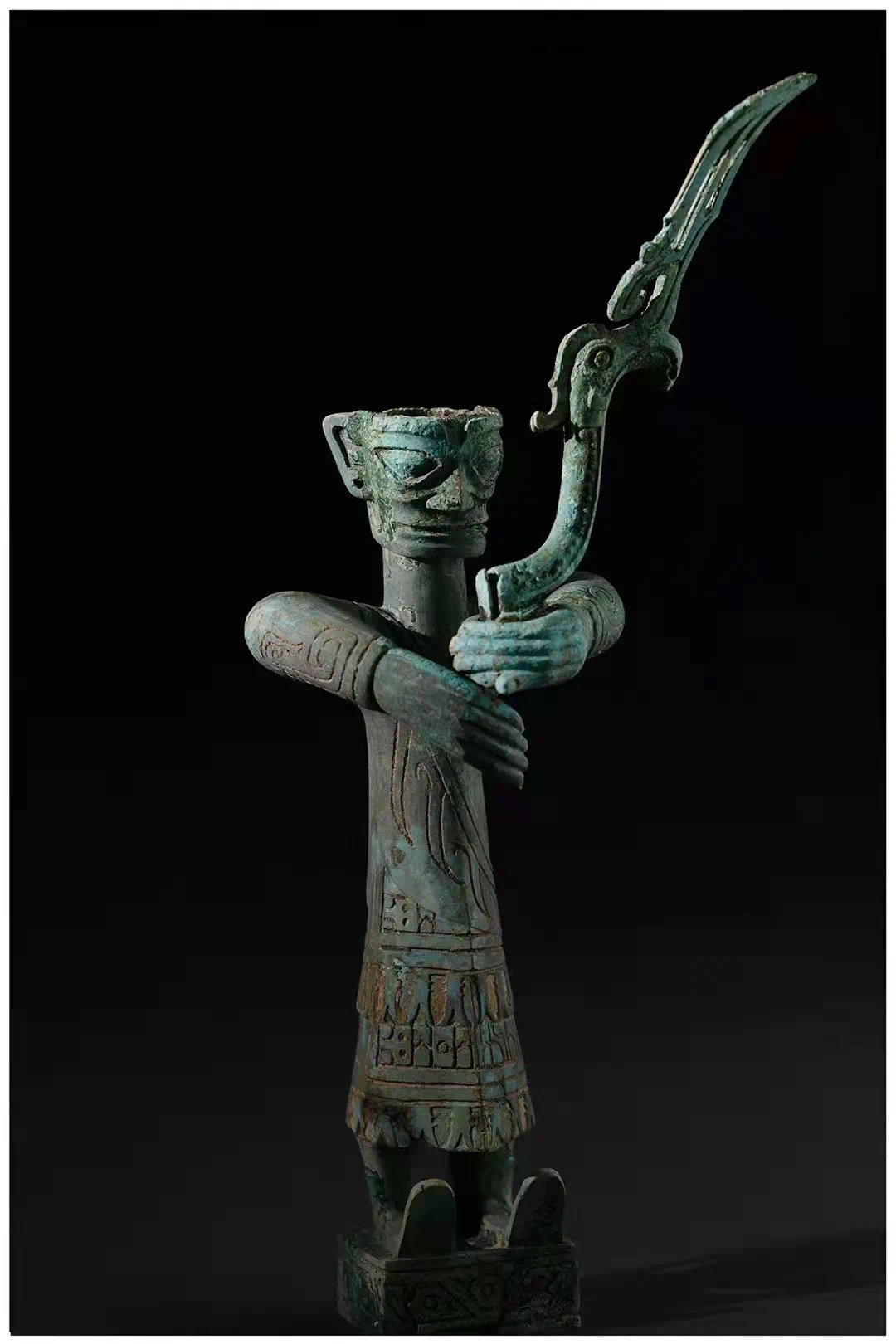 2021年三星堆三号祭祀坑出土的青铜持鸟立人像。