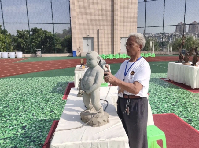 卢若愚从1982年开始接触石雕,时间累积,在当地小有名气。他雕刻的张大千肖像、佛头等线条流畅,生动形象,不仅被专业藏家收购,更有不少作品在公共场所展示。卢若愚表示,雕刻就是赋予石头生命。不同的物品用不同技巧,男性雕像要具有阳刚美,女性雕像要具有温柔美。