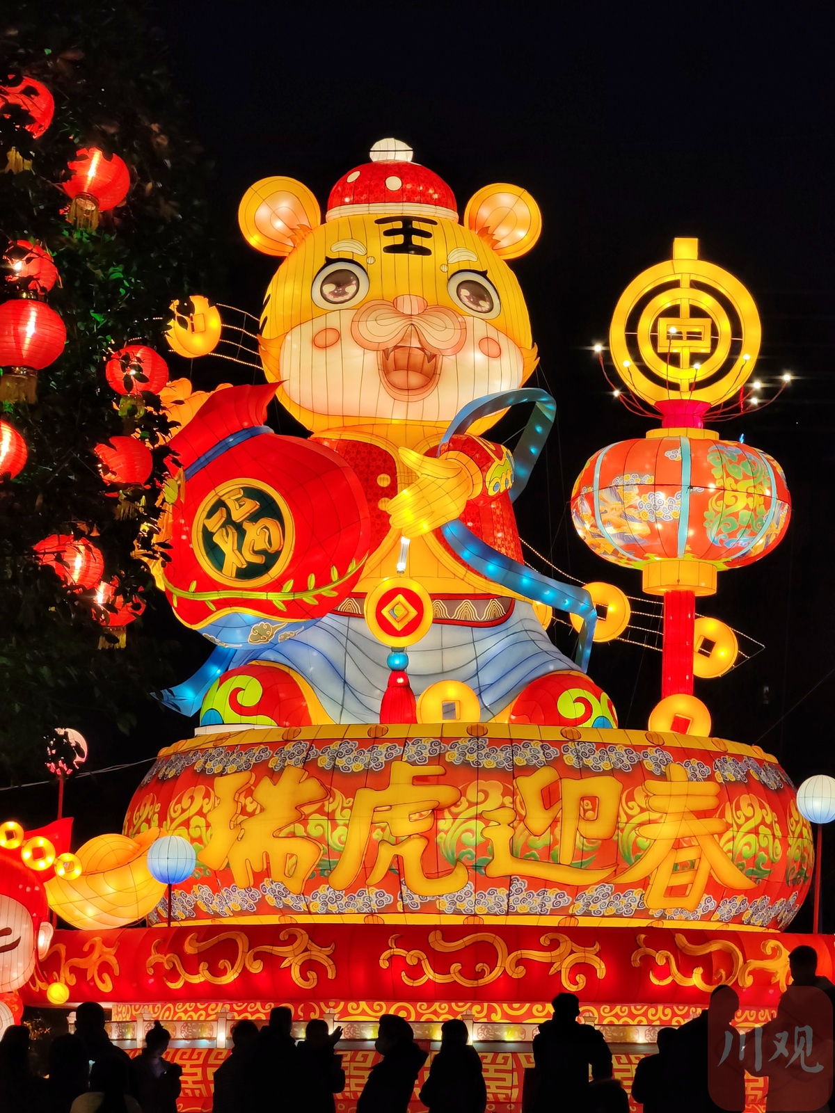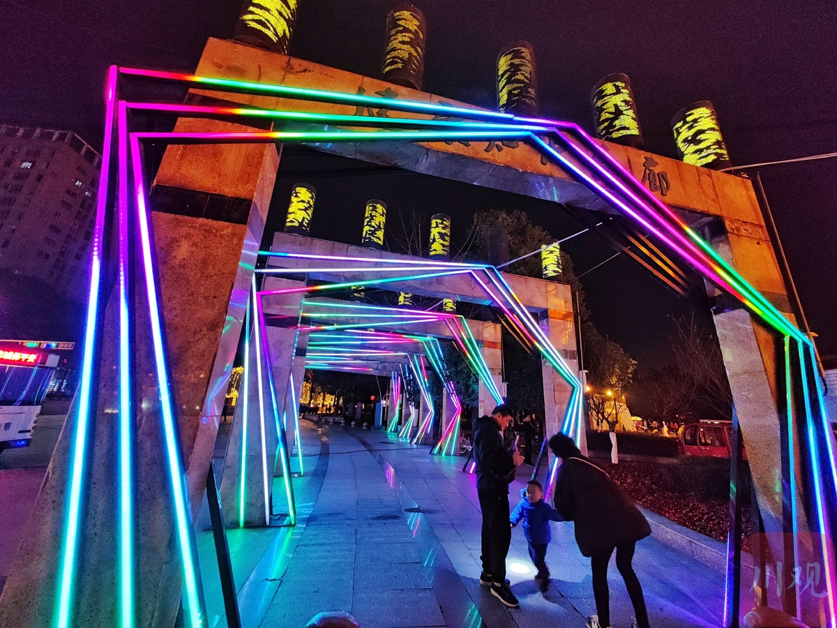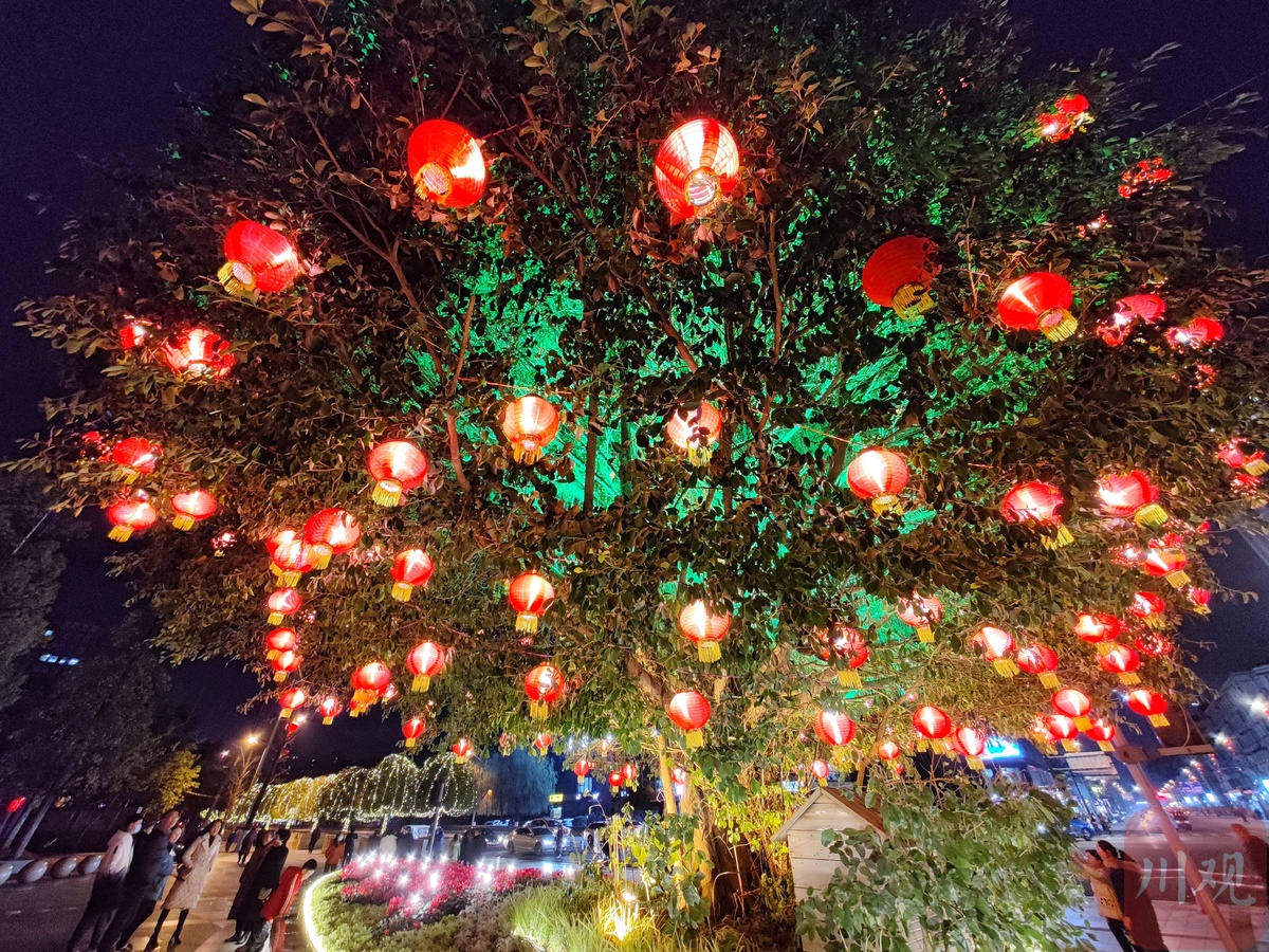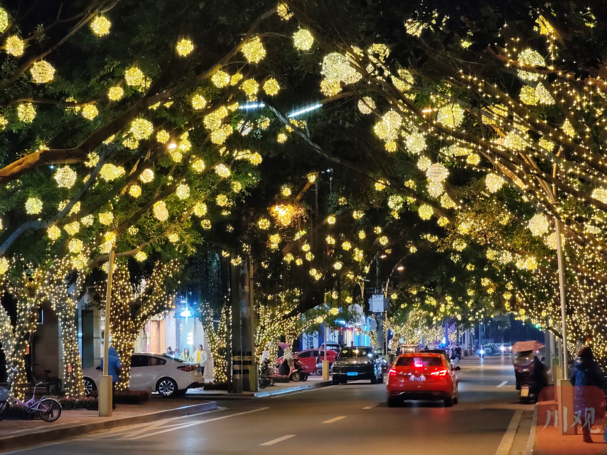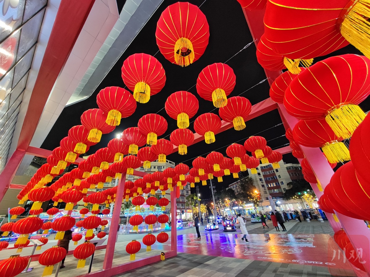 1月29日晚,成都青白江城区主要街道上的节庆彩灯全部点亮,满满的春节氛围。