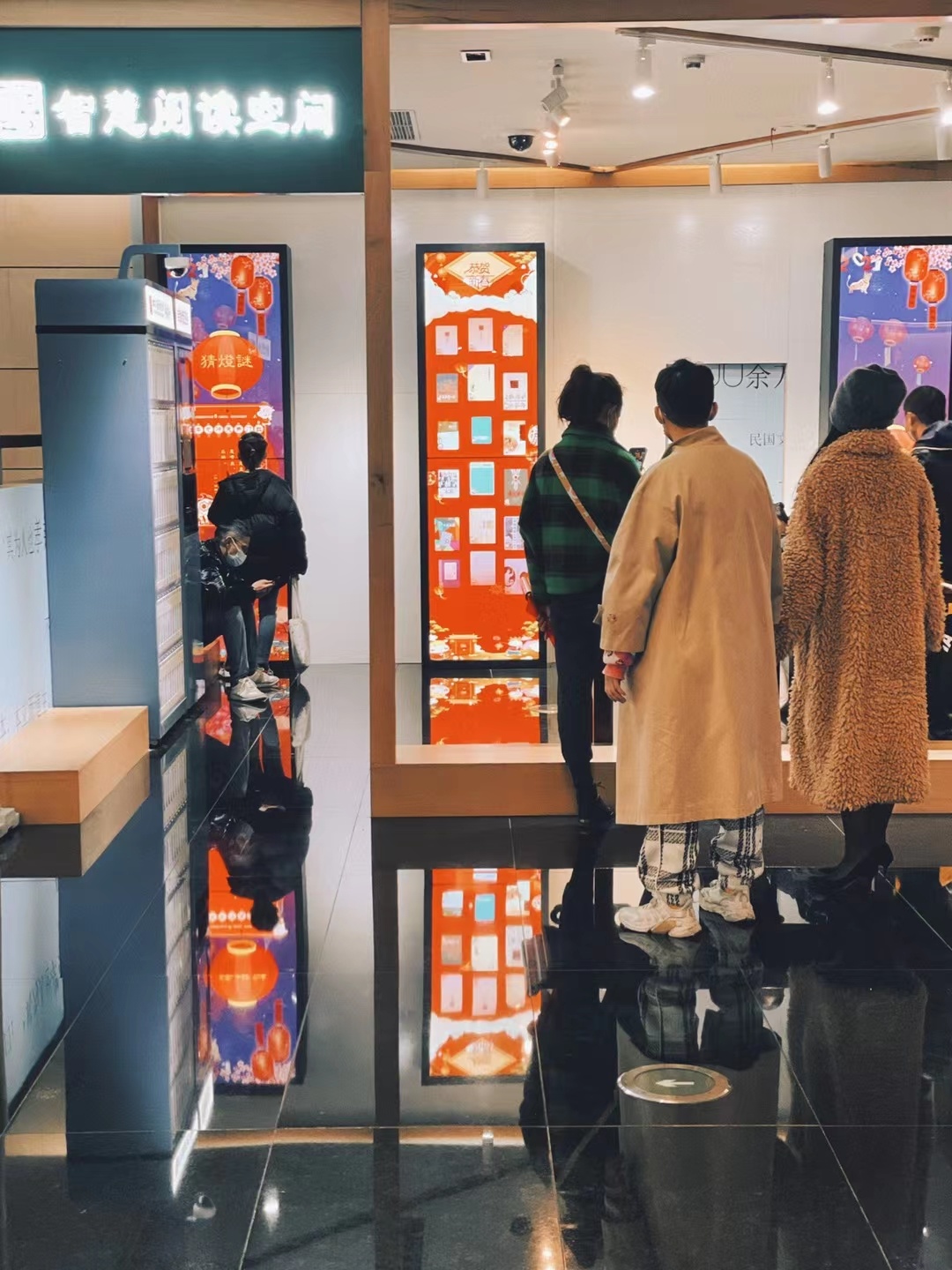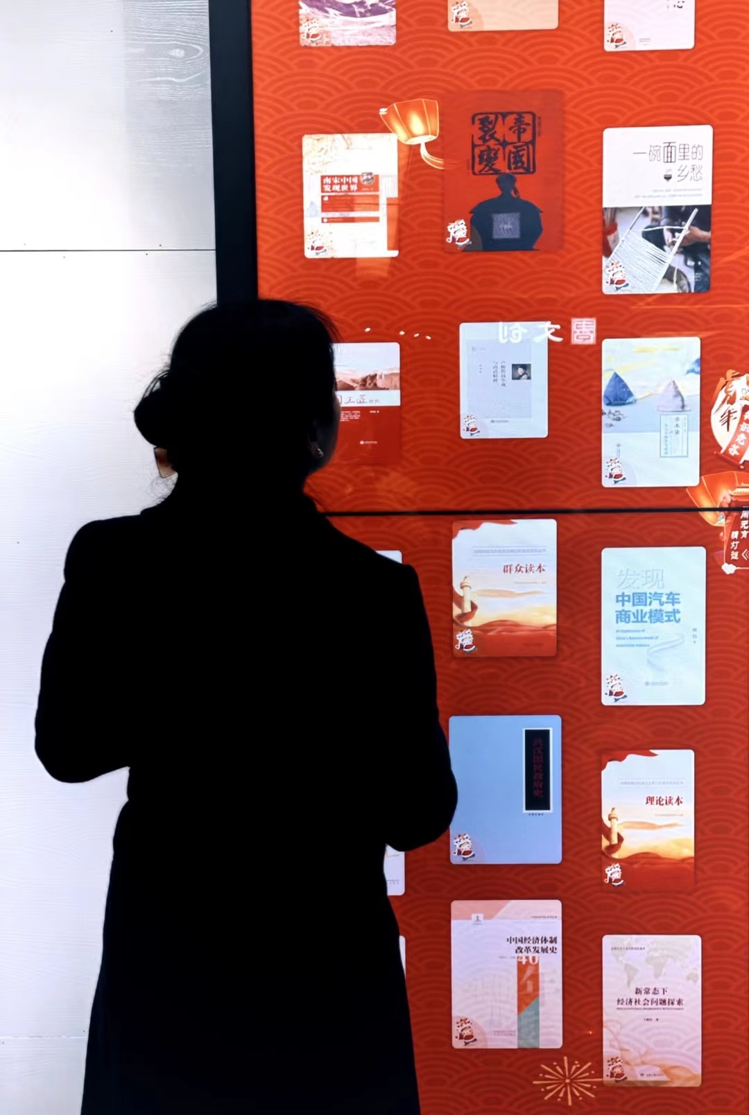 全新对外开放的智慧阅读空间面积不大,一走近,就可以看见三块竖立的红色屏幕。屏幕上,琳琅满目的电子图书顺势落下,如同瀑布一般。四川省图书馆数字资源部主任李莉介绍,这就是“瀑布流电子借阅系统”。该系统功能强大,拥有3000余册电子图书,支持读者在线阅读和手机扫码借阅。“为迎接新春佳节,‘瀑布流’还增设了线上猜灯谜和虎年知识竞答,可以说是能猜灯谜的‘瀑布’。”李莉补充介绍道。