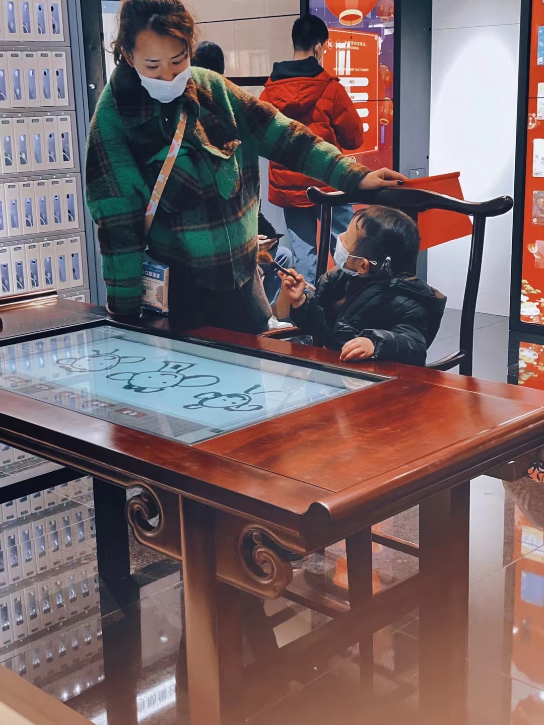 智慧阅读空间中央,分别放置了两张桌子,中间的“智慧屏”同样吸睛。李莉介绍,两张桌子分别为智能棋艺桌和数字书法机。书法机不仅可以自由书写,还可以点击屏幕按钮了解书法知识、进行书法名家作品临摹。更有意思的是,它还具有拍照功能。现场,除了在这里书写,还有不少小朋友在书法机上留下了自己俏皮的绘画作品,萌味十足的绘画引得不少读者围观,并争相拿起旁边的毛笔,体验不一样的书写。