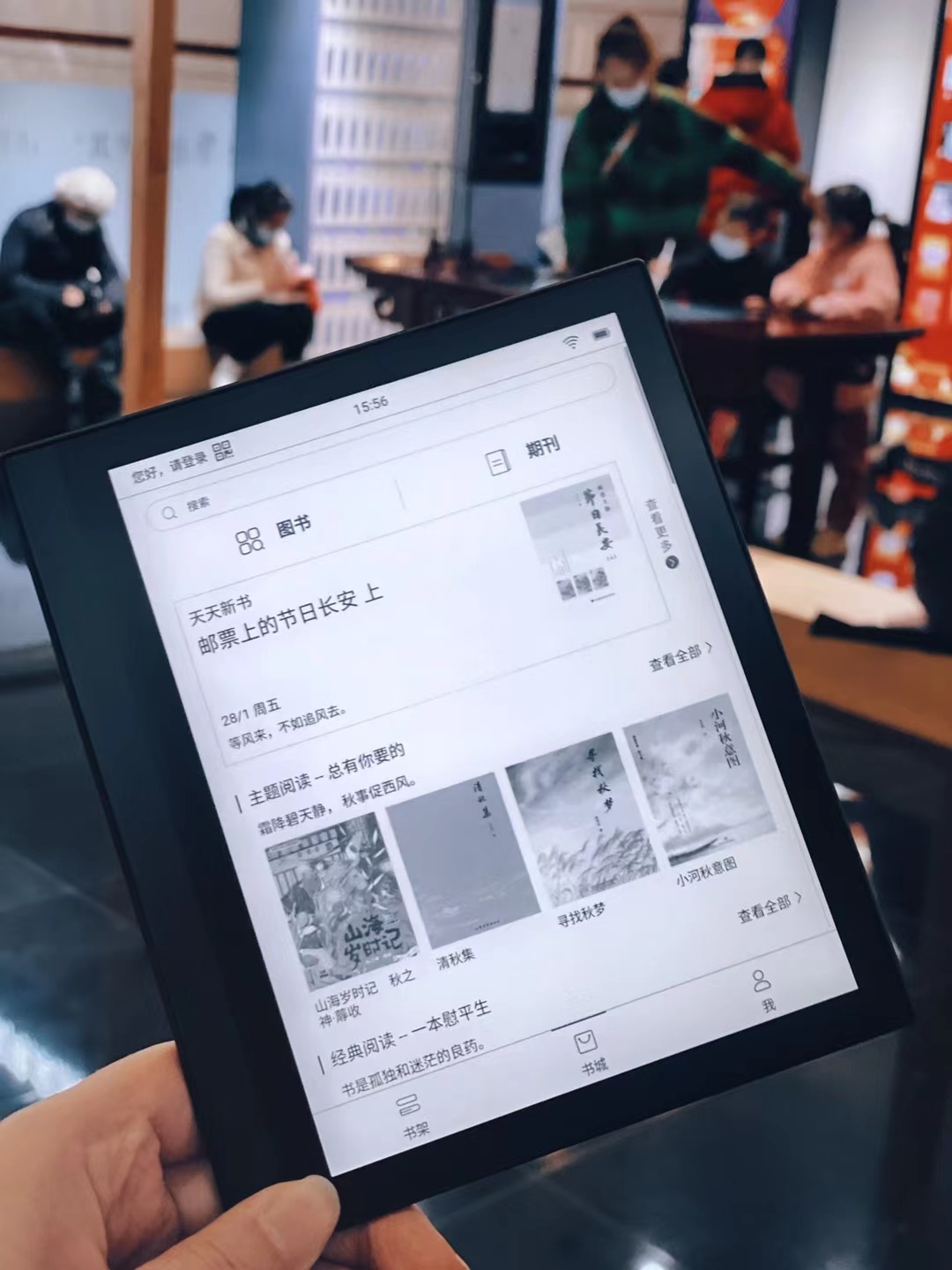 当然,最“豪横”的当属立在墙边的阅读本自助借阅柜。李莉介绍,这是一个神奇的智能书柜,就像哆啦A梦的神奇口袋一样,它能满足读者一次借阅5万册电子书!在这里,读者可借出一个类似Kindle的电子阅读器设备——阅读本,里面设置了阅读本在线书城选书系统,免费提供文学、历史、哲学、艺术、经管、社科、军事等热门图书5万余册。阅读本借阅后,读者通过系统浏览、搜索自己感兴趣的图书,下载到书架离线观看,打造属于个人的移动图书馆。