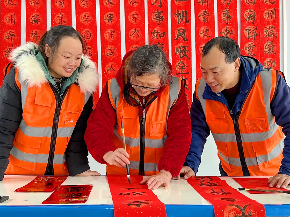红红的春联纸铺满桌,墨香沁人心脾。在阿坝州,书法家们挥毫泼墨,一张张寓意着吉祥如意的“福”字随笔而出,一幅幅火红的春联,渲染出新春的喜气,精湛的书艺博得了在场职工(农民工)赞叹和掌声。在中建二局成都珠江新城国际建设项目工地、中建八局西南公司独角兽岛园区项目工地上,项目工会组织一线建设者写春联共迎新春,书法家执笔、蘸墨、落笔,熟练地在鲜红的楹联纸上一气呵成写下寄托着吉祥如意、幸福平安的对联,等候一旁的工友们接过散发着笔墨清香的对联,脸上洋溢出喜悦的笑容,浓浓的年味跃然于纸上。