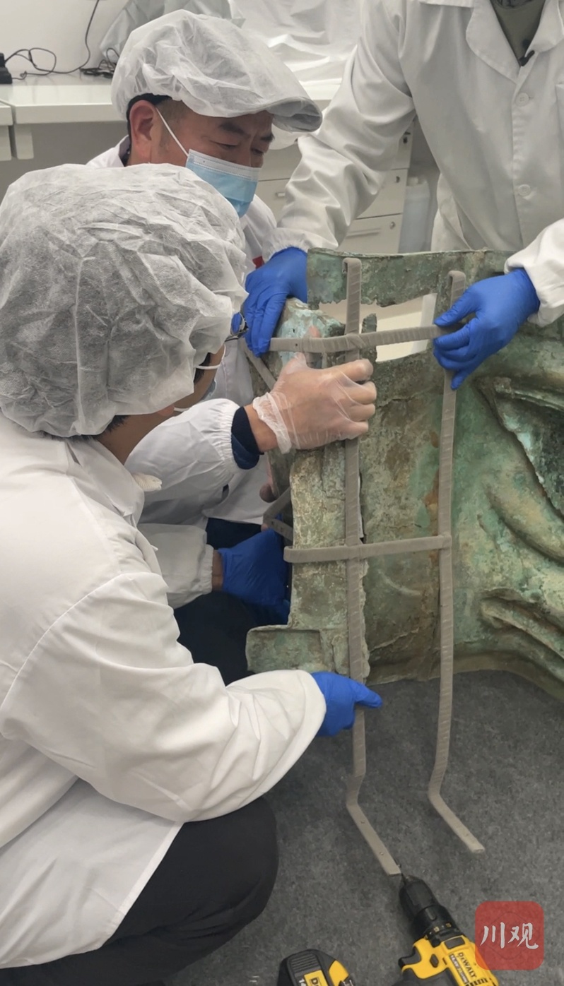 冉宏林介绍,这件面具出土时脸部正面朝下,鼻尖深埋于黄土之中,其上还叠压了近十根象牙。经过三个多月的精心清理,青铜大面具才全部露出。2021年6月23日,考古文保专家将面具提取出坑。由于面具体量很大,埋藏关系复杂,为了让面具能安全提取,文保专家精心拟定了提取方案,采用木条在面具内侧固定形成支撑、再把竹条反扣到面具底部,形成承托,最后用高分子绷带作为吊带,借电动起重滑轮吊装出坑。