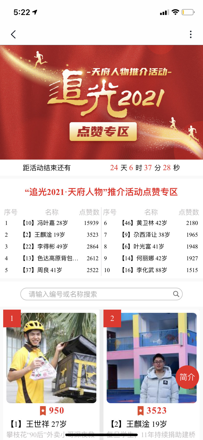 点赞活动将持续到2月25日24点,如果你想了解哪些人排名靠前,如果你也想追光这些天府人物,赶快拿起手机,为他们加油点赞吧!