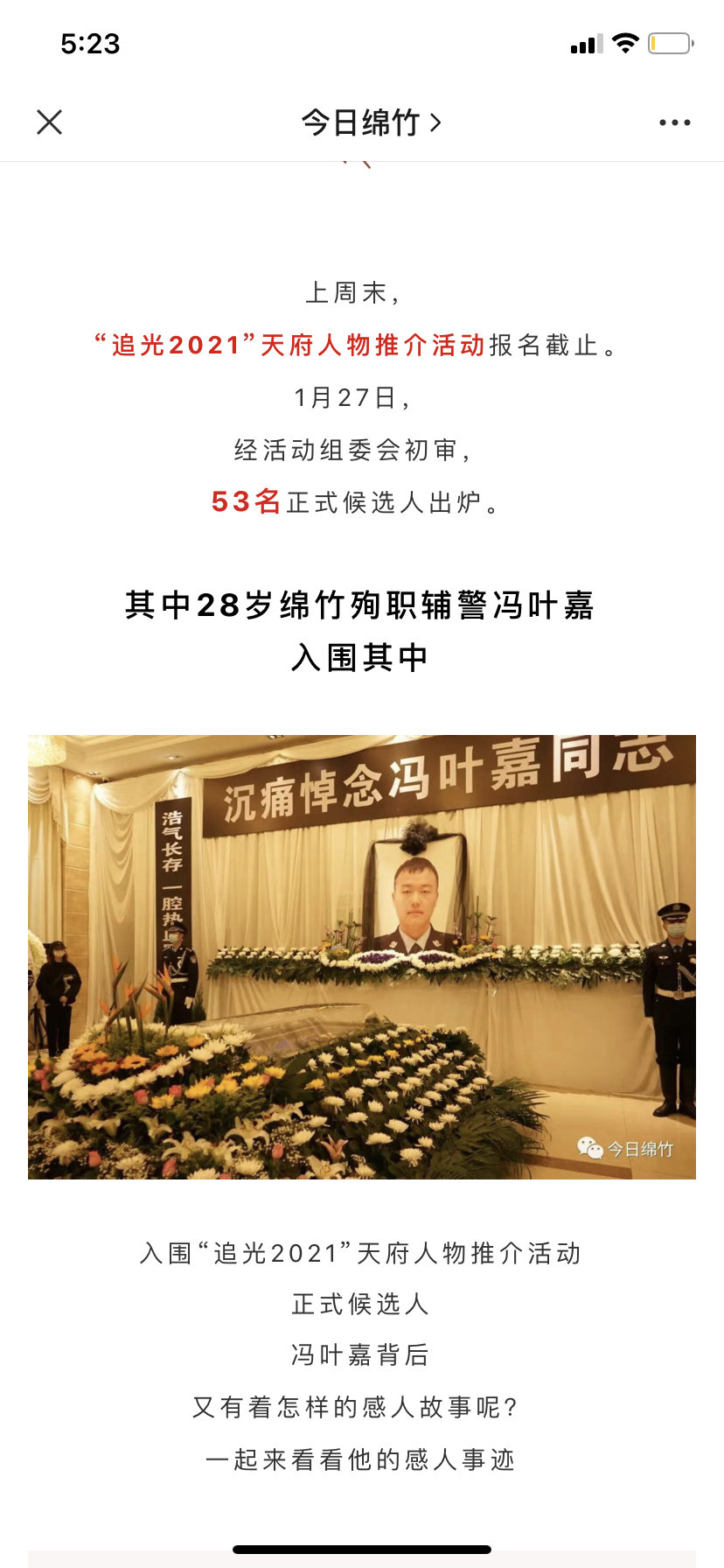 点赞排行榜上,排在第一的候选人冯叶嘉是一位已牺牲的辅警。2021年11月22日晚上9时许,绵竹特巡警大队辅警冯叶嘉为救一名轻生女孩,纵身跳入冰冷的人民渠中,不幸殉职。