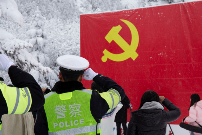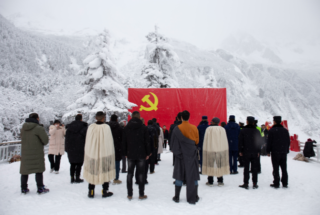“今天,我们站在巍巍贡嘎山下,向党致以青春的礼赞;今天,我们对党许下青春的誓言,新的百年,听党话、感党恩、跟党走,同心向党,奔赴远方。”2月1日,正月初一,在甘孜州海螺沟四号营地,茫茫白雪覆盖,巍峨肃穆的贡嘎雪山与巨幅鲜红党旗交相辉映,海螺沟景区“雪山下的党课”再次开讲,活动在4名少先队员洪亮的朗诵声中拉开序幕。