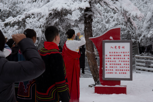 “在正月初一参加‘雪山下的党课’,我特意穿上民族节日的盛装。在庆祝新年的同时,祝福祖国、感恩党。”磨西镇青冈坪村党员吕东才表示,作为一名基层党员,新年向党做出承诺,未来一定会带领好群众致力发展,听党话,永远跟党走。