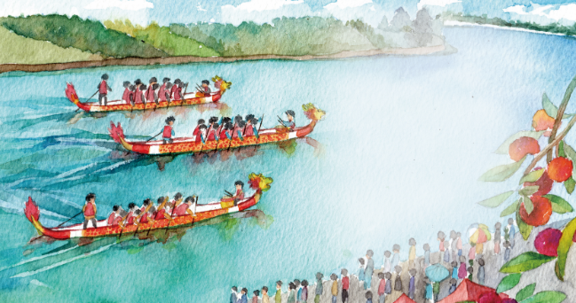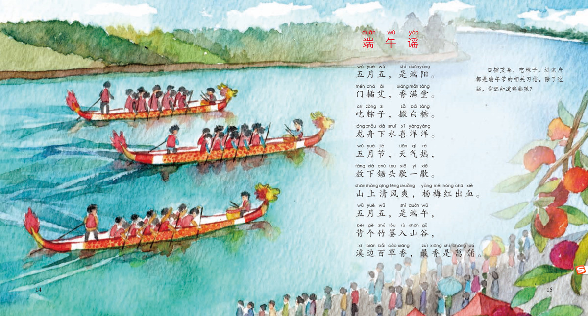 “五彩绳,糯米粽,人人都把屈原说。赛龙舟,挂艾草,妖魔鬼怪全赶跑。”
