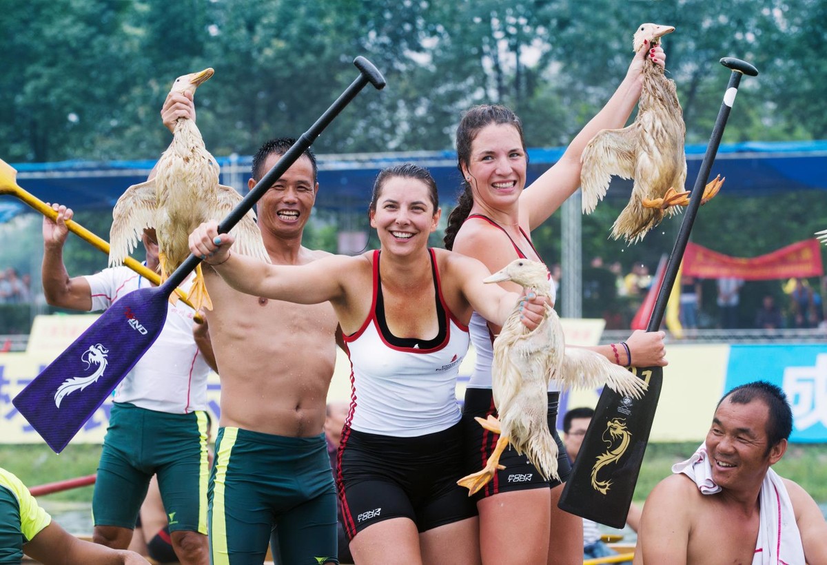 从此,当地人为了纪念苏王结婚之喜,就将原来农历五月初五的端阳划龙舟风俗改在五月十五举行,活动中加进“抢鸭子”内容,沿袭至今。