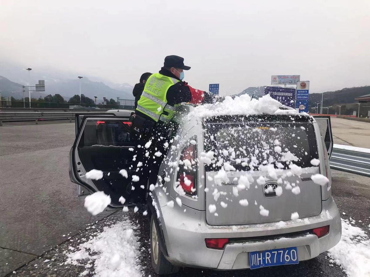 2月1日大年初一,四川高速公安二分局民警在中子服务区巡逻过程中,发现许多从广元曾家山旅游景区返程的车辆上,车顶多了一个人——“雪人”。