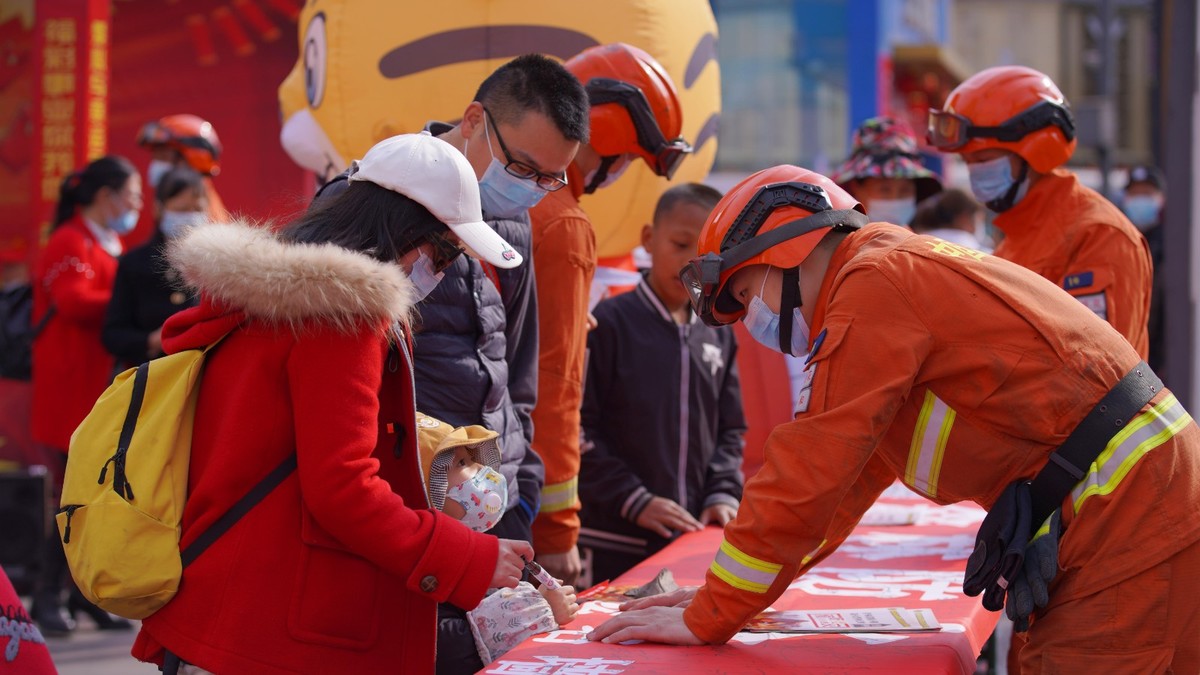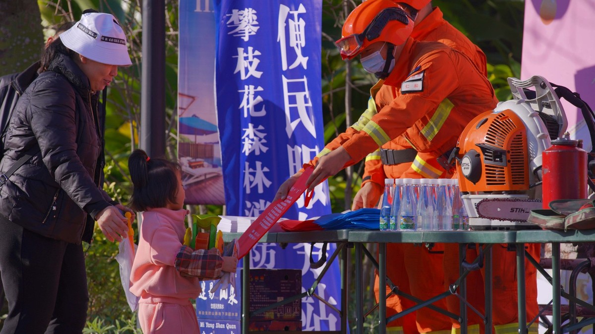“你好,我们是森林消防员,这是防火宣传单,里面有一些森林防火安全知识,进入林区请勿携带火源。”期间,消防员们向前来与人偶合影的群众发放防火宣传单、纪念袋等特色宣传品,向市民游客普及《森林防火条例》及森林防火相关知识。