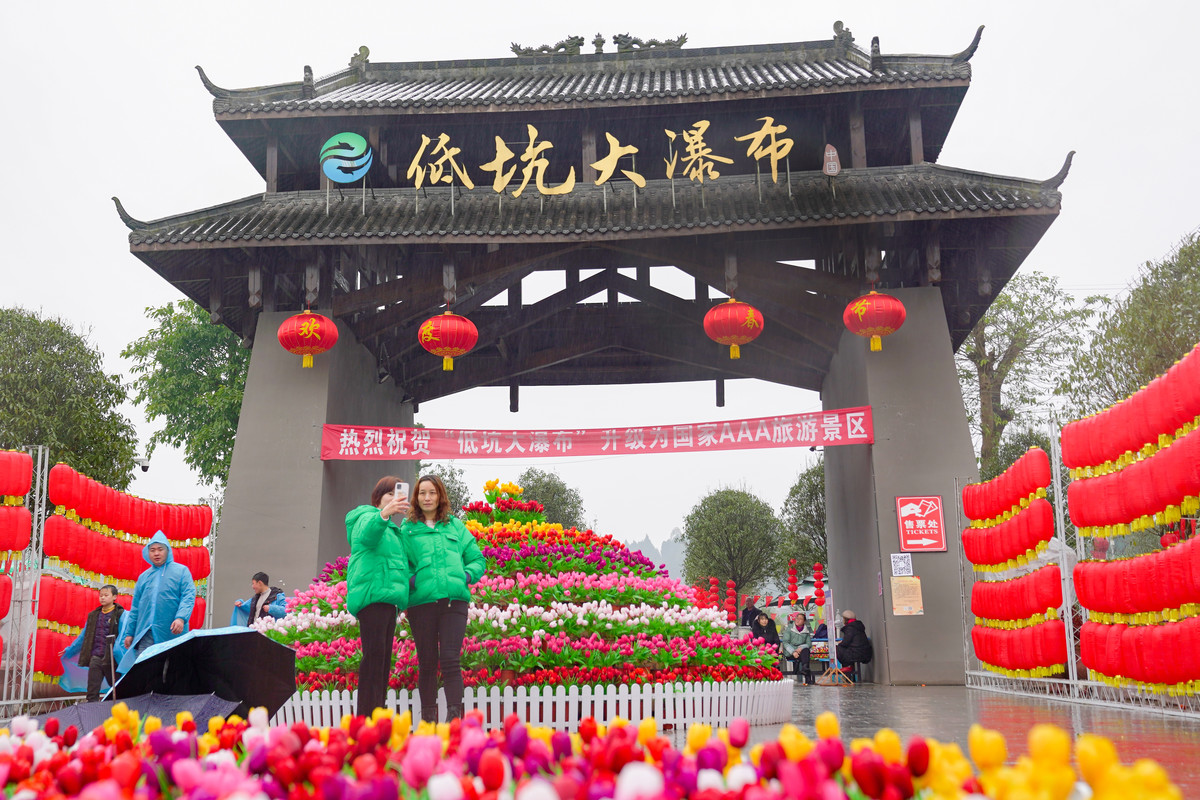 “听说这里有一座大瀑布,今天带着家人一起前来拍照打卡。”2月3日,来自重庆市合川区的游客陈建宏,带着一家三口到低坑大瀑布景区游玩,感受大自然的独特风景和景区内的人文气息。