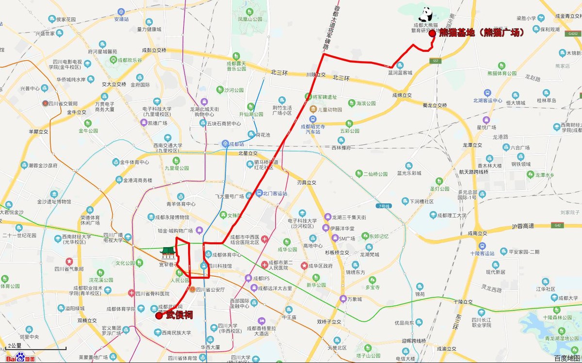 (去程)武侯祠(锦里)站发出,沿武侯祠大街路、通祠路、文翁路、东城根南街、东城根上街、东门街、长顺中街、长顺上街、蜀都大道少城路、祠堂街、西御街、东御街、人民南路一段、人民中路、西玉龙街、玉带桥街、锣锅巷、草市街、北大街、解放路、驷马桥街、昭觉寺南路、蓉都大道、熊猫大道、楠竹巷、箭竹路,行驶至熊猫基地(熊猫广场)站。