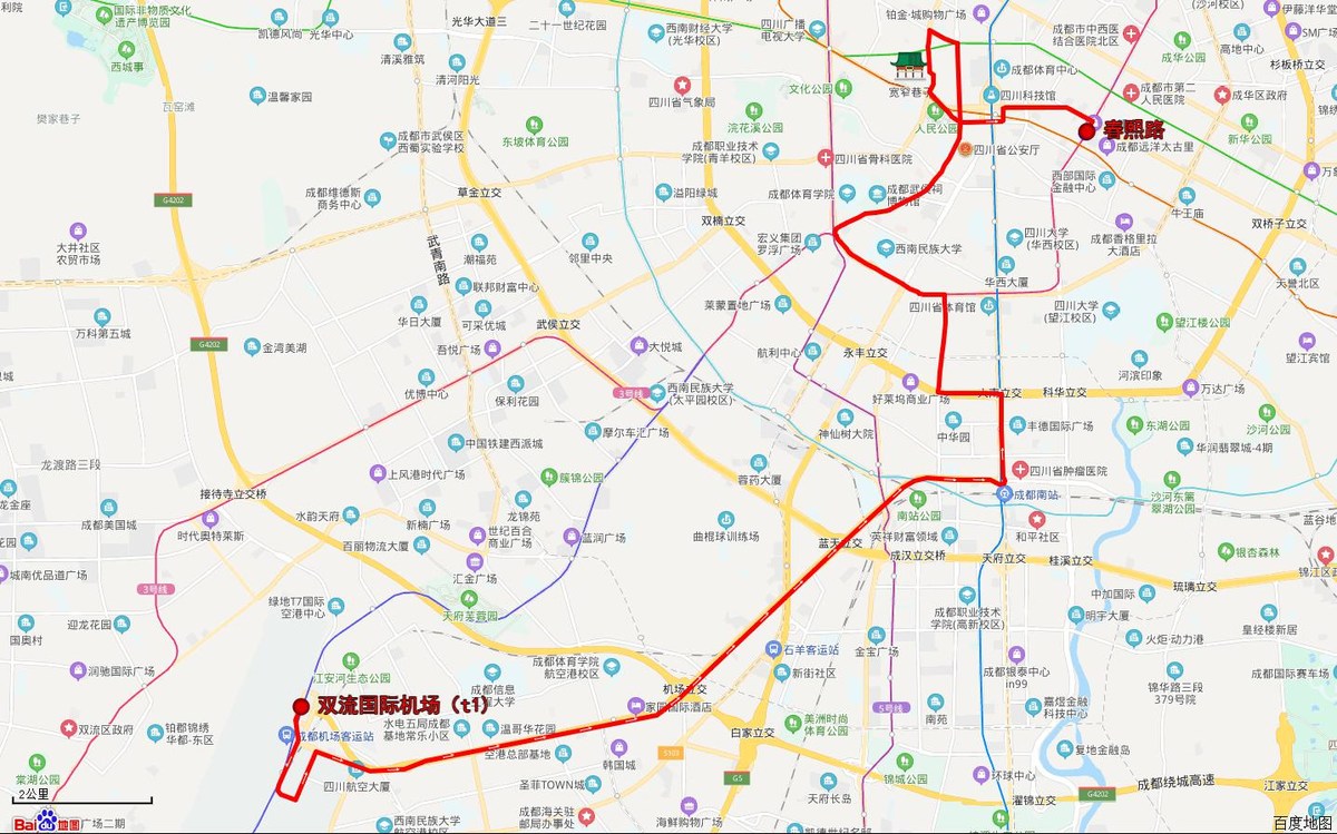 (去程)双流国际机场(t1)站发出,到双流国际机场(t2),再经机场东一路、机场高速、人民南路四段、人南立交桥、二环路南三段辅道、玉林南路、玉林中路、玉林北路、一环路南三段、一环路南四段、武侯祠大街、通祠路、文翁路、东城根南街、东城根上街、东城根中街、东城根下街、东门街,长顺中街、长顺上街、蜀都大道少城路、祠堂路、西御街、东御街、人民南路一段,蜀都大道人民东路、蜀都大道总府路、红星路三段,行驶至春熙路站。