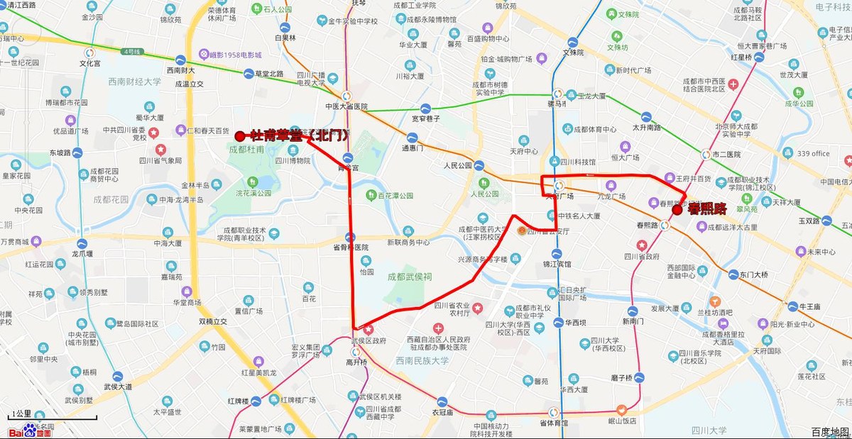 (返程)春熙路站发出,经蜀都大道总府路、蜀都大道人民东路、人民南路一段、西御街、人民南路一段、红照壁街、金盾路、文翁路、通祠路、武侯祠大街、一环路南四段、一环路西一段、青羊上街、青华路,行驶至杜甫草堂站。