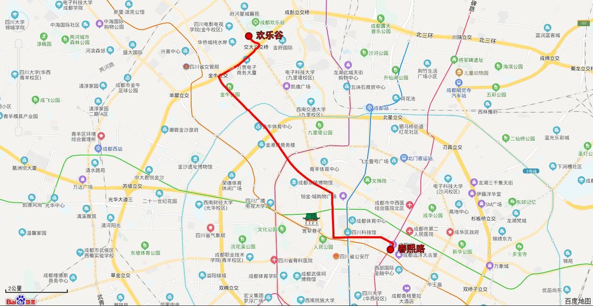 (去程)春熙路站发出,经蜀都大道总府路、蜀都大道人民东路、蜀都大道人民西路、东城根上街、东城根中街、东城根下街、八宝街、西大街、西月城街、花牌坊街、金牛大道营门口路、金牛大道茶店子路、西三环路五段、北三环路一段、西华大道,行驶至欢乐谷站。
