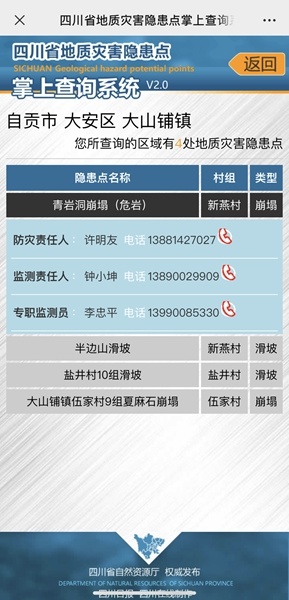 该区域地灾隐患点的具体位置、名称和类型等信息一目了然,就连防灾责任人、监测责任人和专职监测员的姓名电话信息都一目了然。