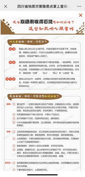 首页点击“这些防灾知识你必须掌握”,便可了解最实用的防灾知识,对崩塌、滑坡、泥石流等地质灾害,分门别类进行防灾科普。