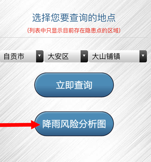 B. 也可在手动查询页面,点击降雨风险分析图,了解查询目的地的地灾气象风险预警图