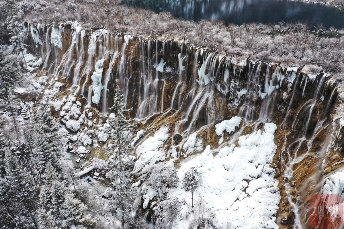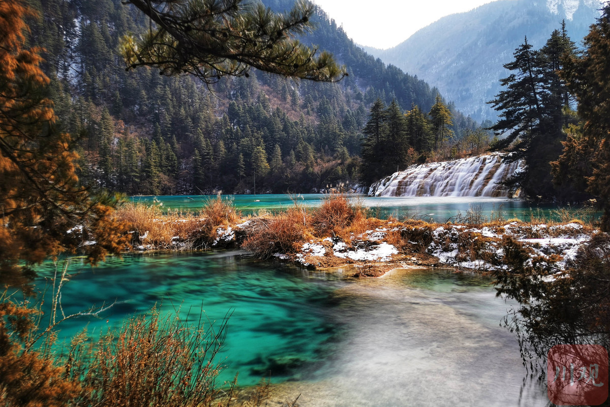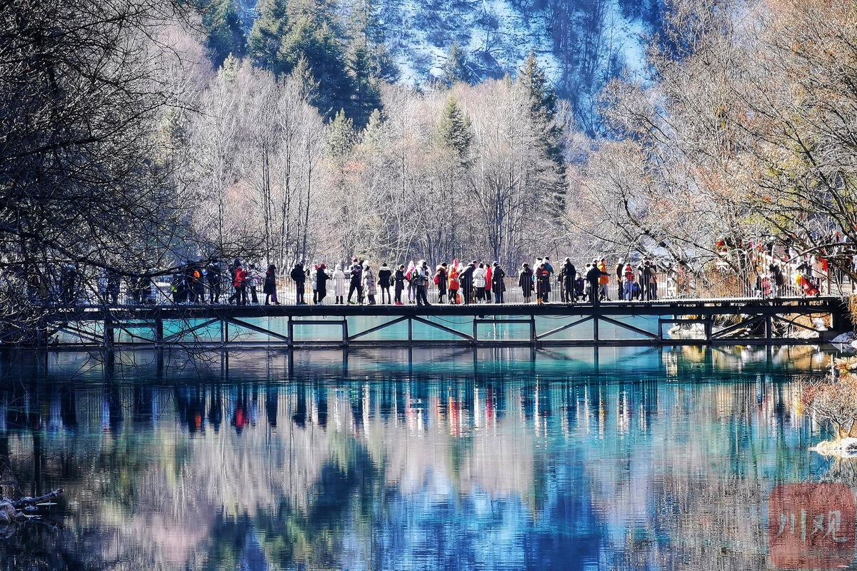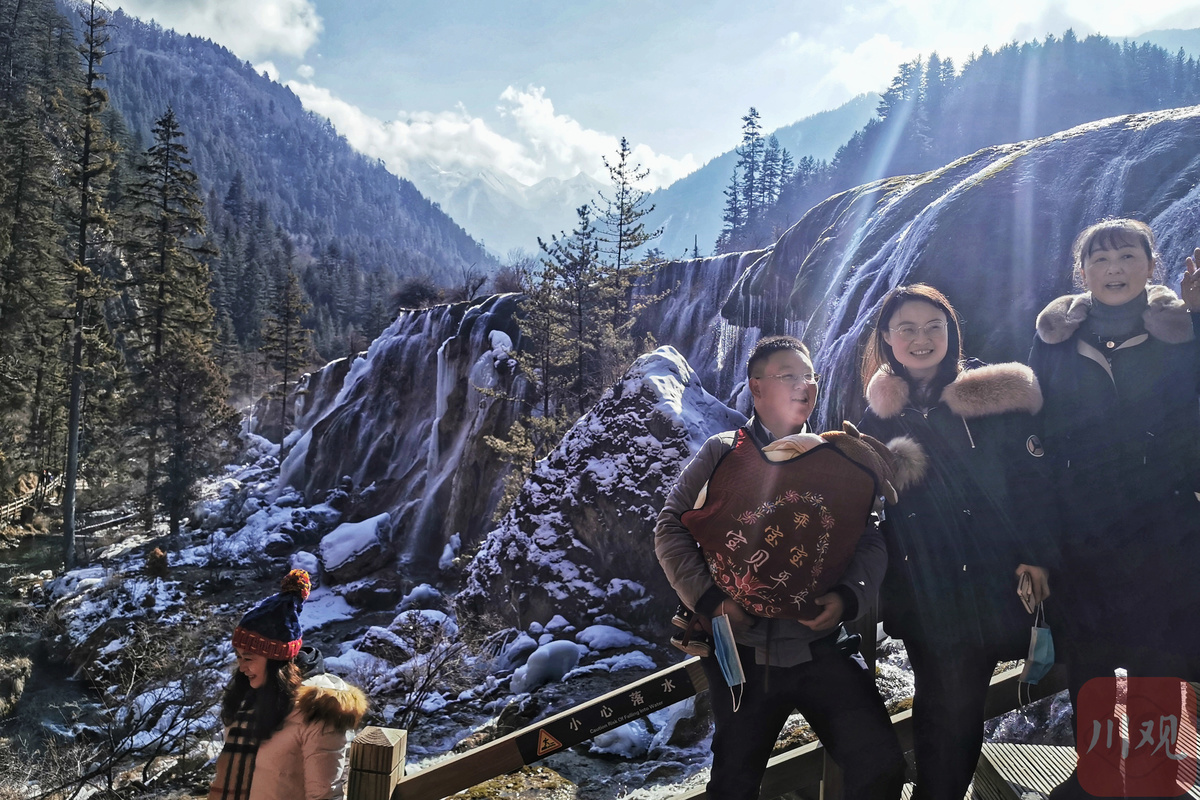 湛蓝的海子在阳光的照耀下波光粼粼,瀑布倾斜而下的水流也与悬挂着的天然艺术冰雕相映成趣,一处处美景在新春时节为游客献上了一场视觉上的盛宴,游人们在九寨美景中亲近大自然,畅享新年快乐。