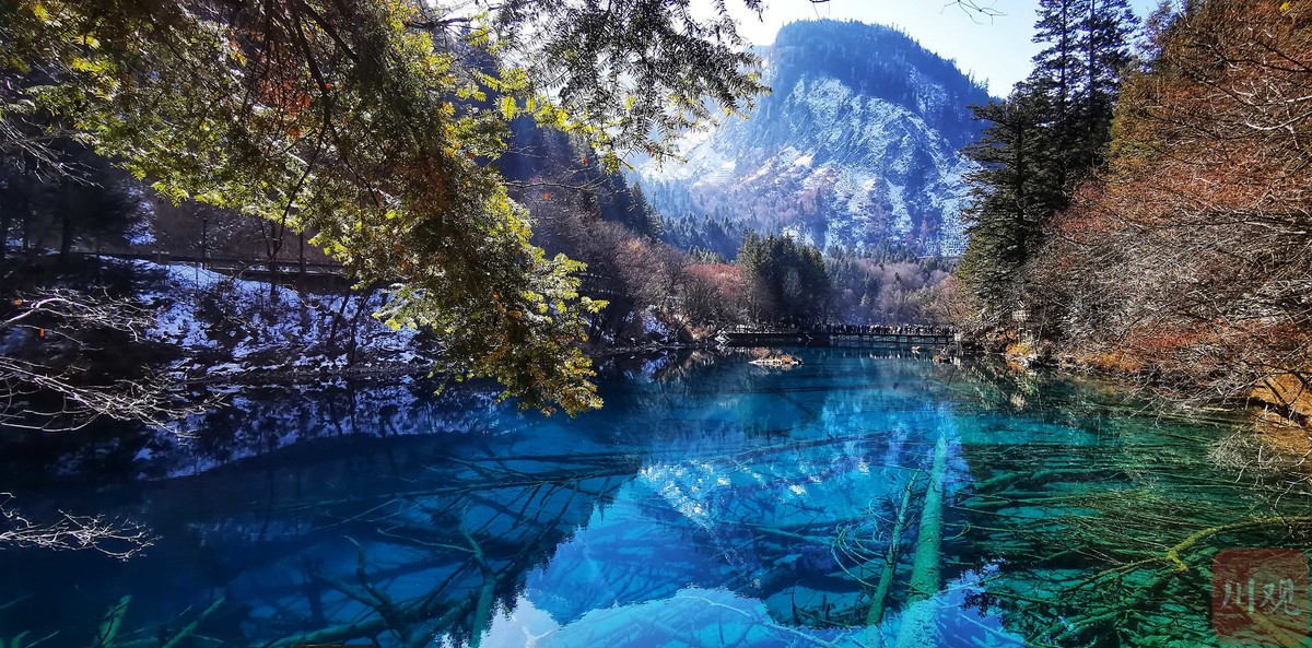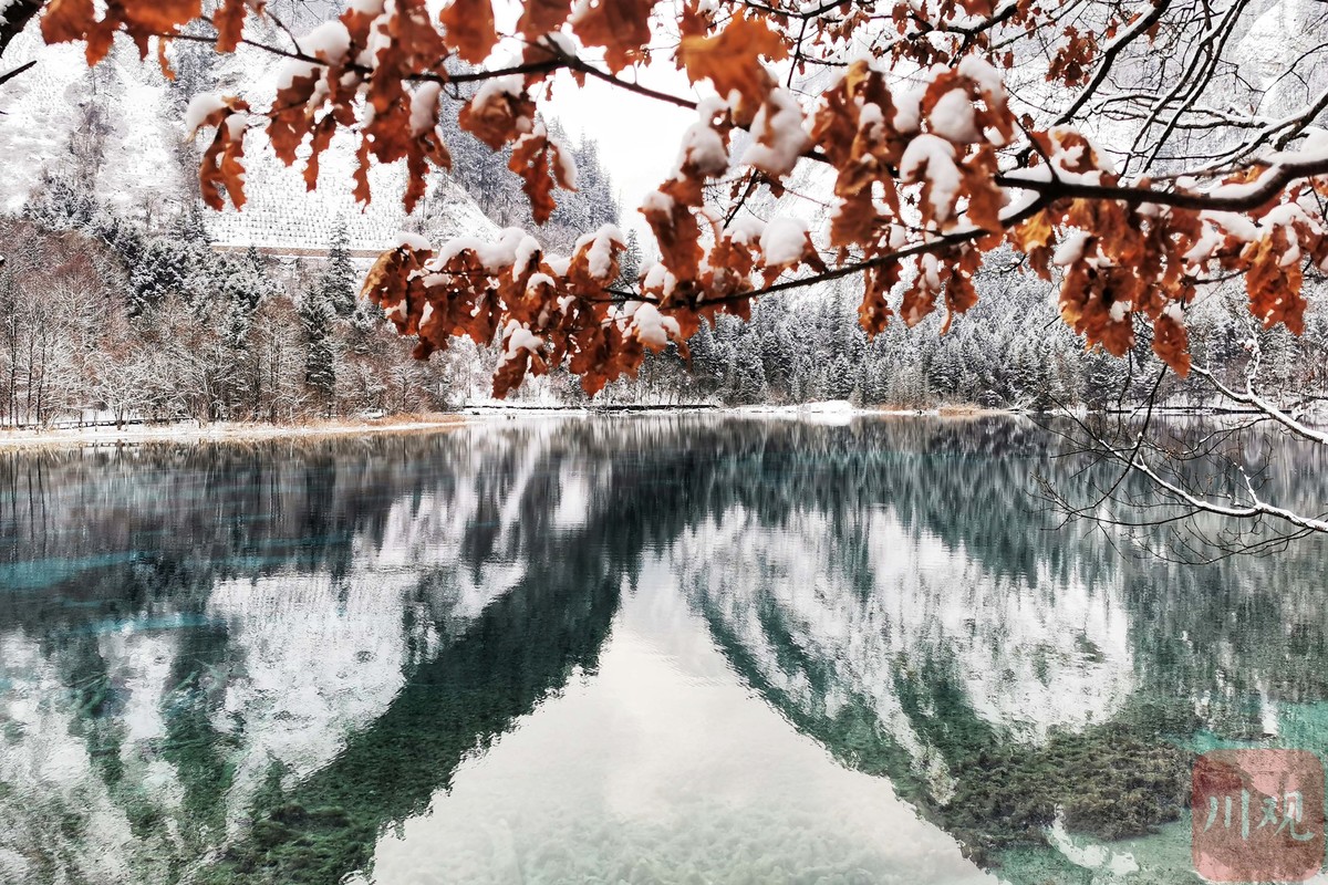 五花海的红叶、白雪、碧水相映成趣