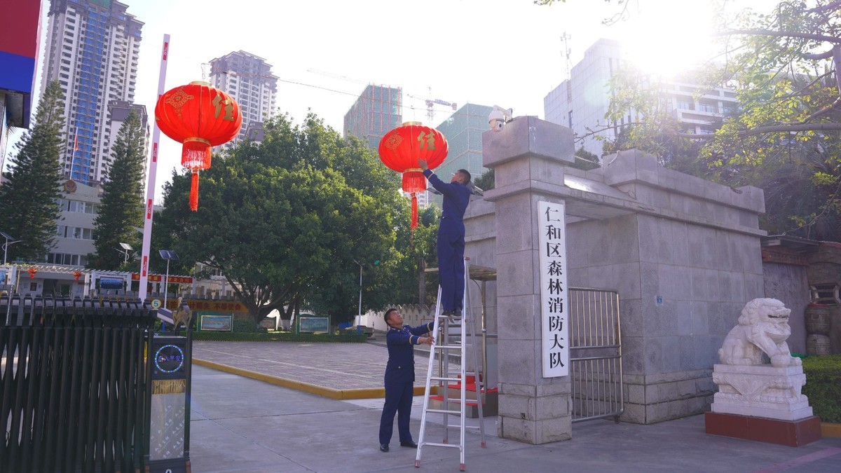 大年三十,新年前一天,事情少了许多。攀枝花市森林消防支队仁和大队院子里偶尔传出来几声张罗声,挂灯笼,贴对联、窗花,新年浓厚的氛围并未在此缺席。