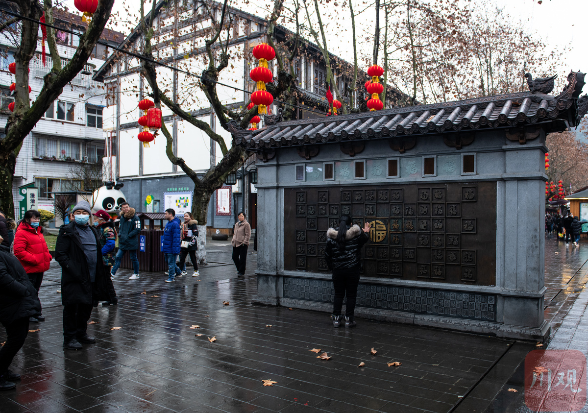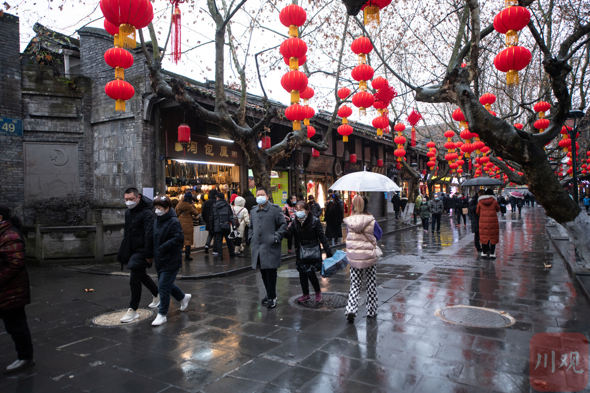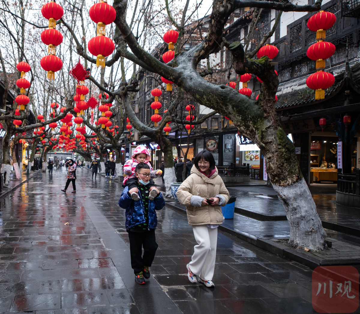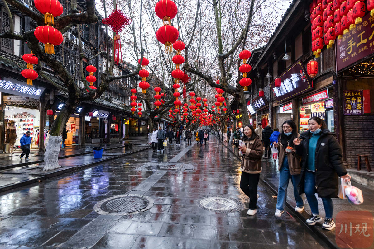 2月6日,大年初六。在淅淅春雨中,游客们来到装扮一新的都江堰灌县古城景区打卡游玩,度过春节假期的最后一天。