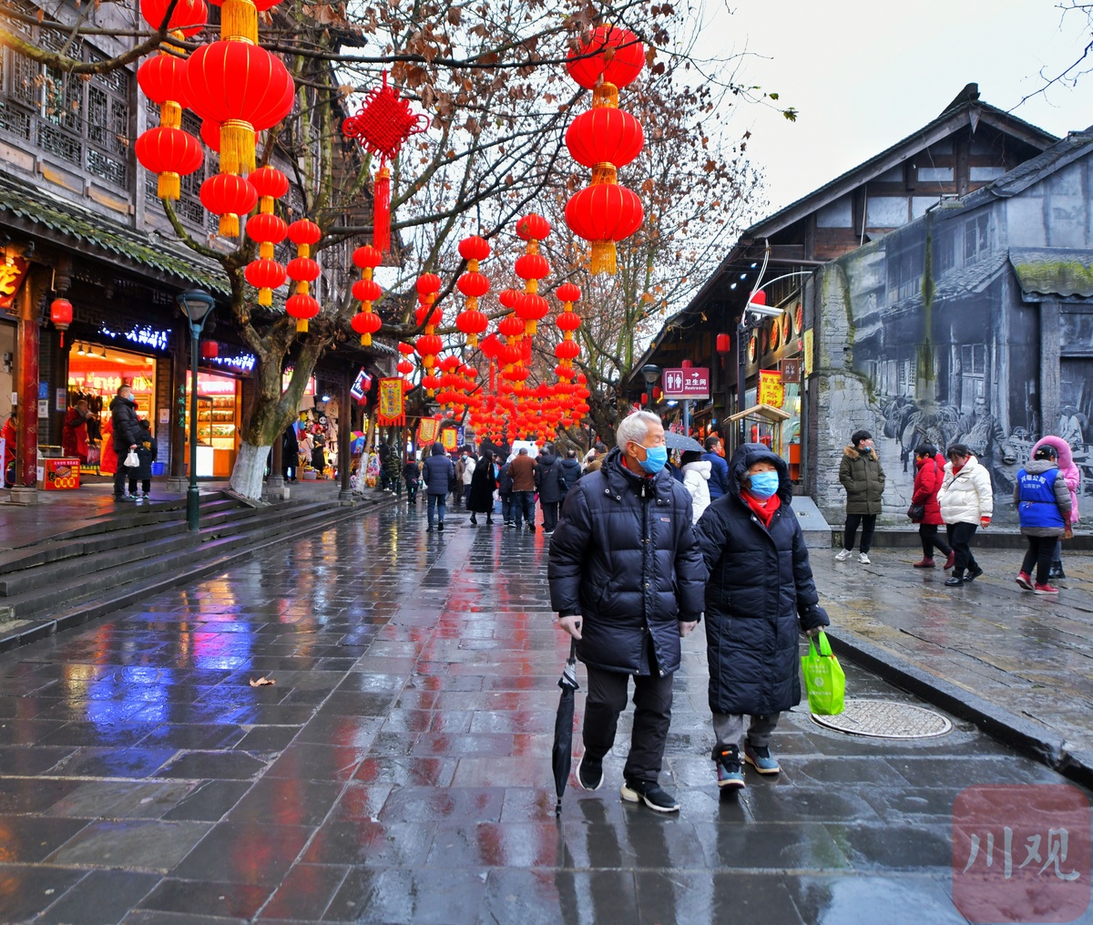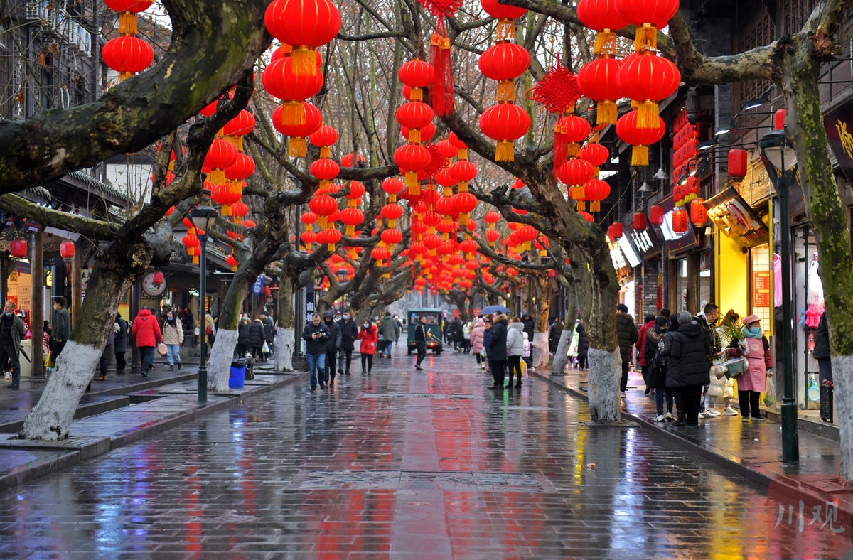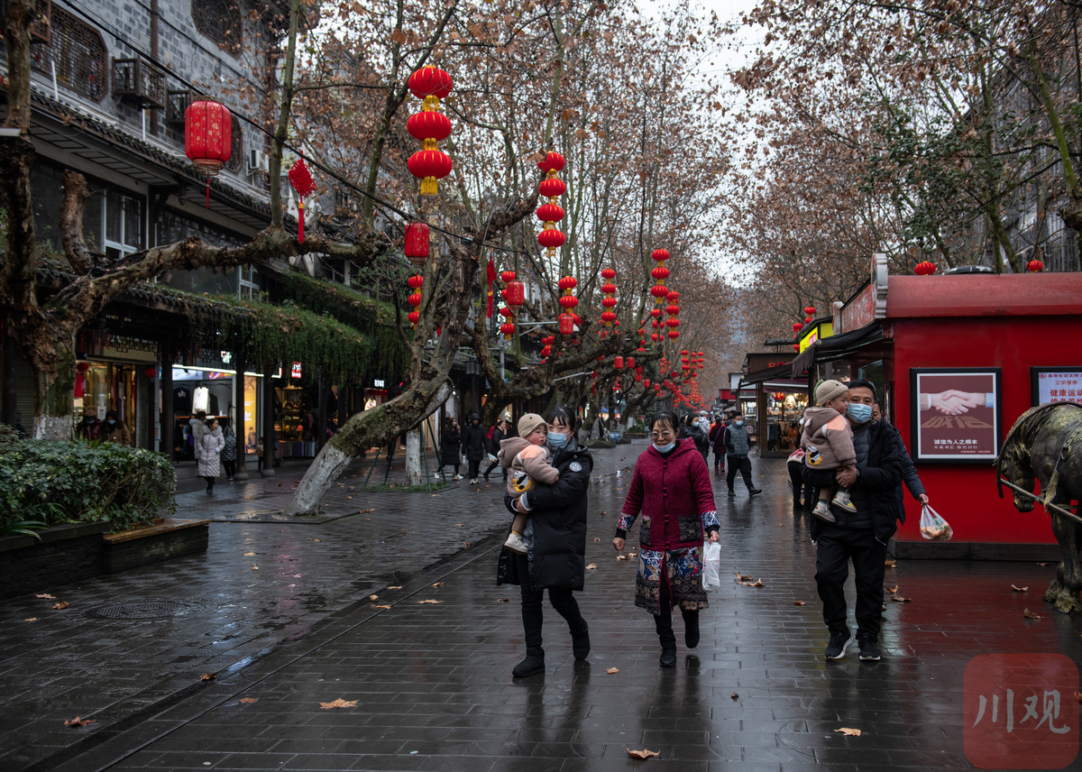2月6日,大年初六。在淅淅春雨中,游客们来到装扮一新的都江堰灌县古城景区打卡游玩,度过春节假期的最后一天。
