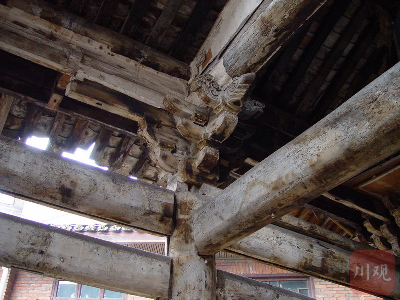 修缮中发现,观音阁翼角部位经过多次重修,情况最为复杂。上檐 4 个角科均为后期更换,制作极为粗糙,用材也不是楠木。椽子中发现有几根椽尾窄椽头宽,且椽子侧面有钉眼痕迹,可能是原来的翼角椽,为放射形布椽。大角梁上的痕迹也与现有大刀木不完全吻合,可能以前安有子角梁。翼角处使用的勾头瓦也与别处不同,质地轻薄,为仿汉代“与天无极”篆文瓦当。此次修缮维持平行布椽、大角梁加大刀木的做法,保留了不同时期的历史信息。