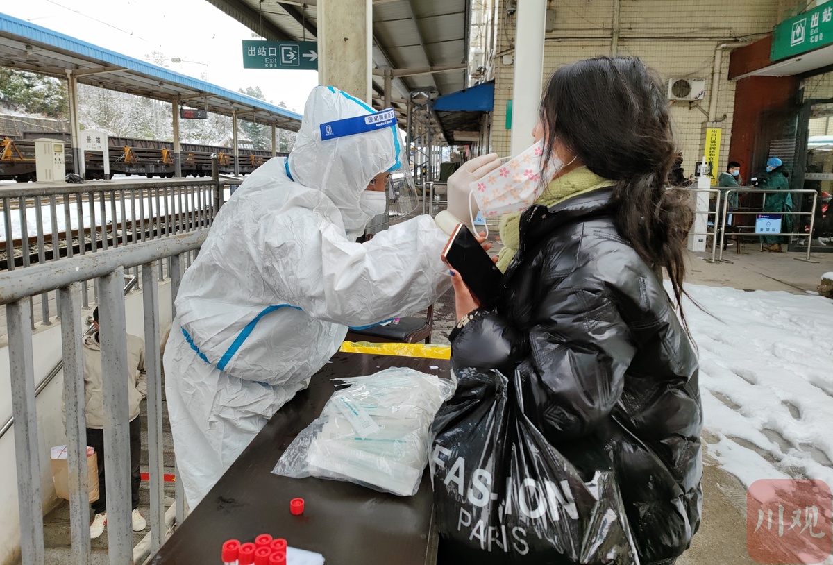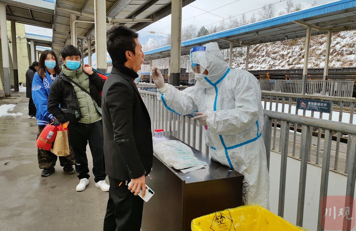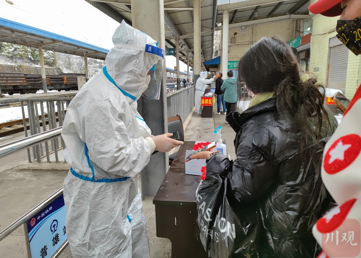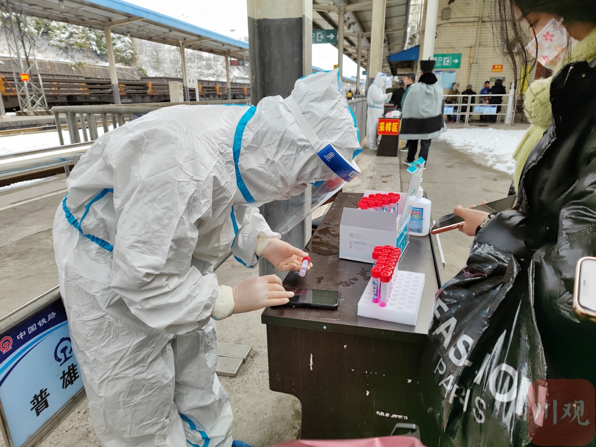 2月2日,在凉山州越西县普雄站核酸检测点,防疫人员坚守一线,对外地返乡人员免费进行核酸检测。
